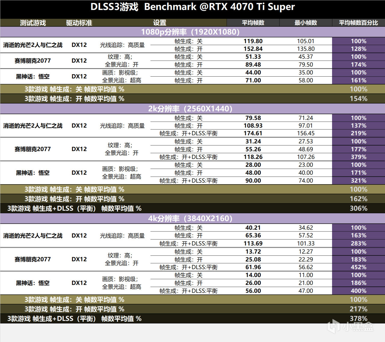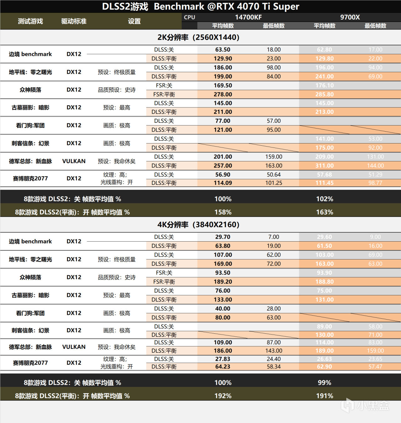 ▼基于DLSS的作用机理就没有测1080p的情况。2k分辨率下,开启DLSS(平衡级)后,所有测试游戏都在100fps以上,相对与关闭DLSS的情况,平均帧数提高到了160%,9700X同样稍有优势;K分辨率下,所有测试游戏都在60fps以上,相对与关闭DLSS的情况,平均帧数提高到了190%,相比2k分辨率提升明显。
