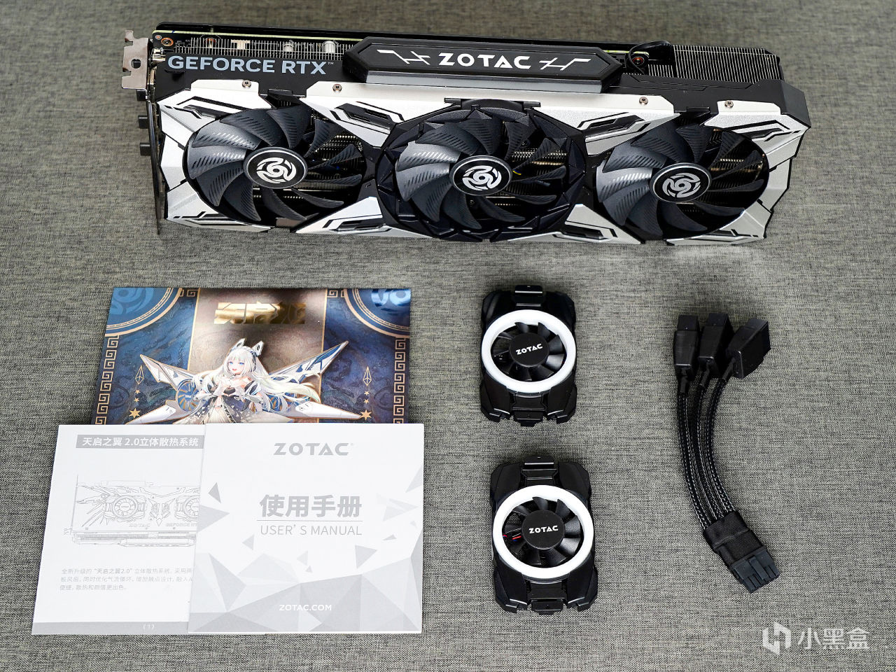 ▼打开包装,除了显卡本体外,附件有一个16pin转双8pin的供电线,两个“天启之翼“风扇,以及使用手册,风扇安装说明等。