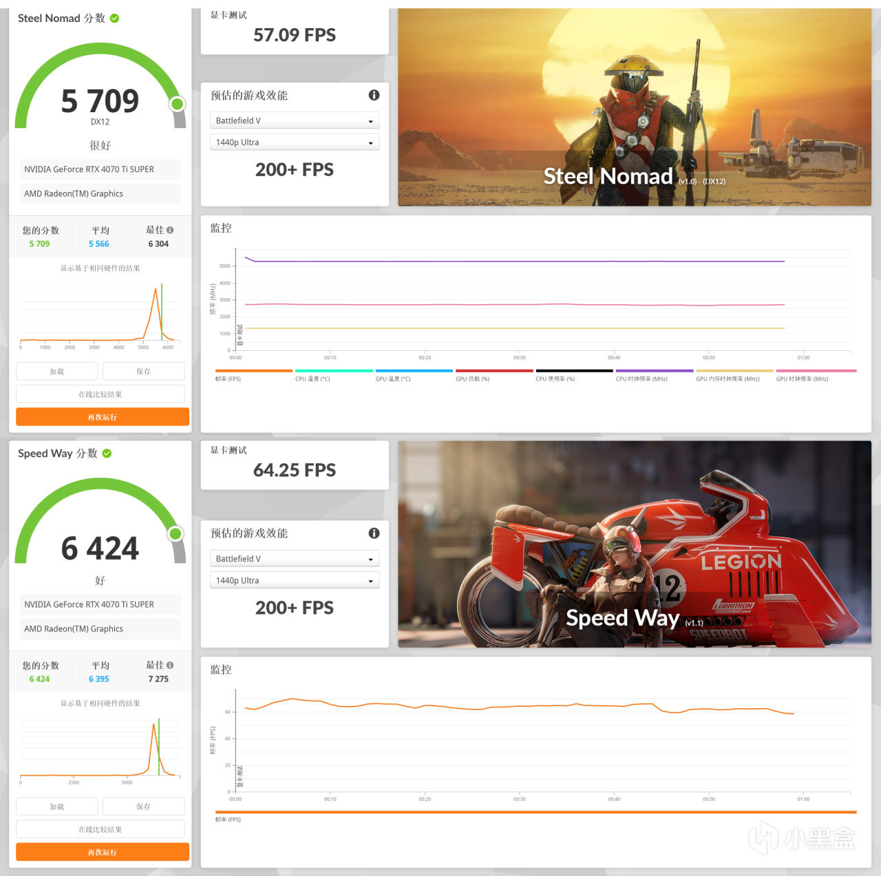 ▼Speed Way则是用于光追的重负载测试,它使用光线追踪和实时全局照明来渲染逼真的光照和反射。由于原生分辨率为2K,所以RTX4070Ti S取得的分数也要较高,平均帧数为64.25fps,流畅度不成问题。