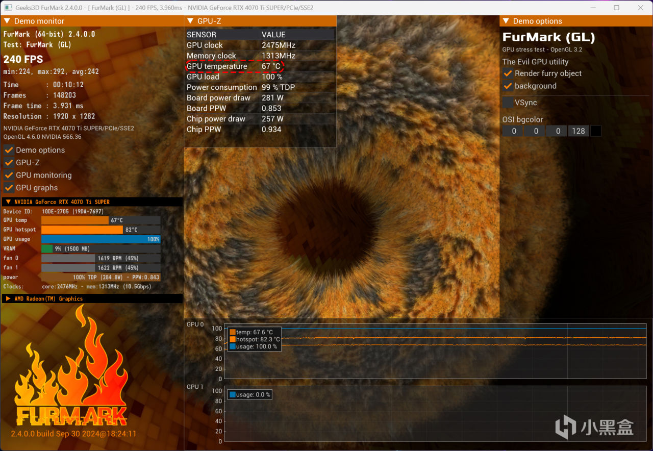 ▼Furmark烤机测试,参数设定为1080p分辨率、0AA,10分钟后,温度稳定在67℃。GPU-Z显示的功耗为285w。不到70℃的温度表现真是不错。