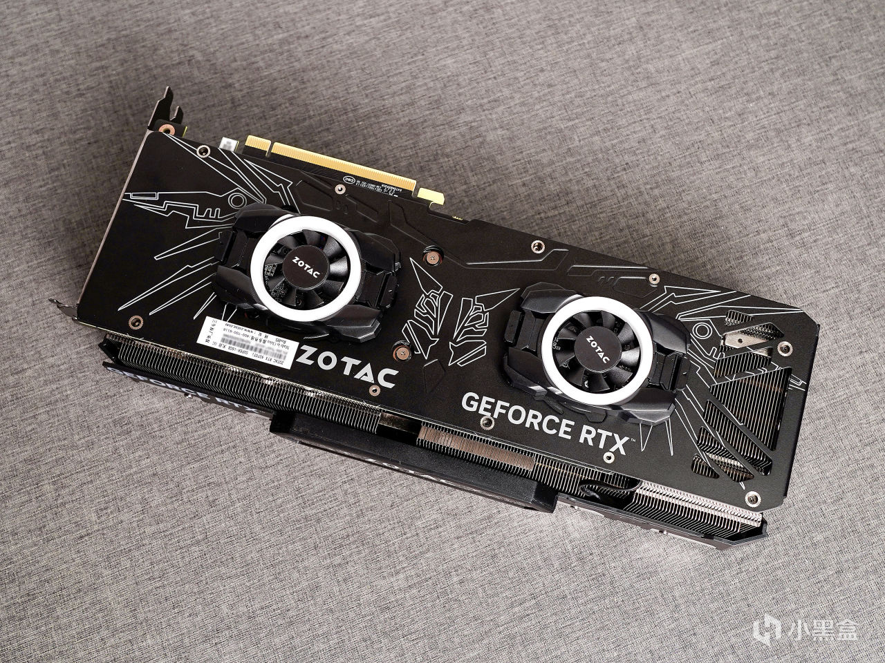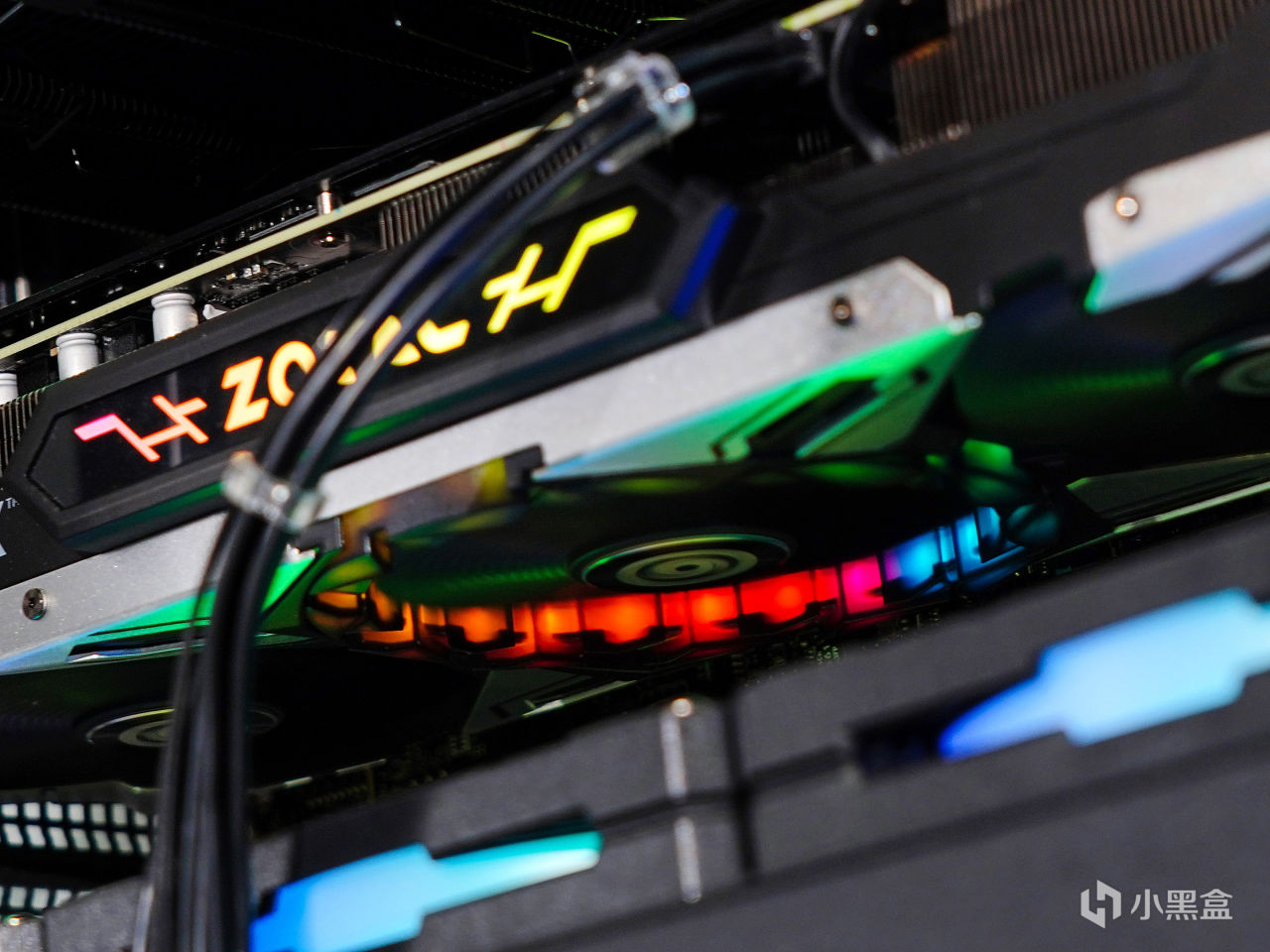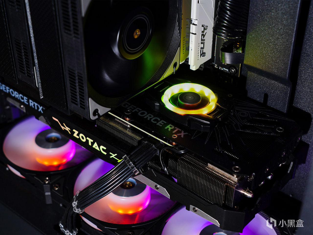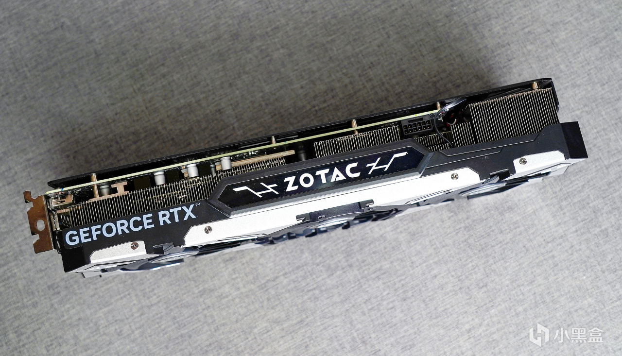 ▼显卡厚度基本为3槽,侧面中间的索泰“ZOTAC”部分也具有ARGB灯效。