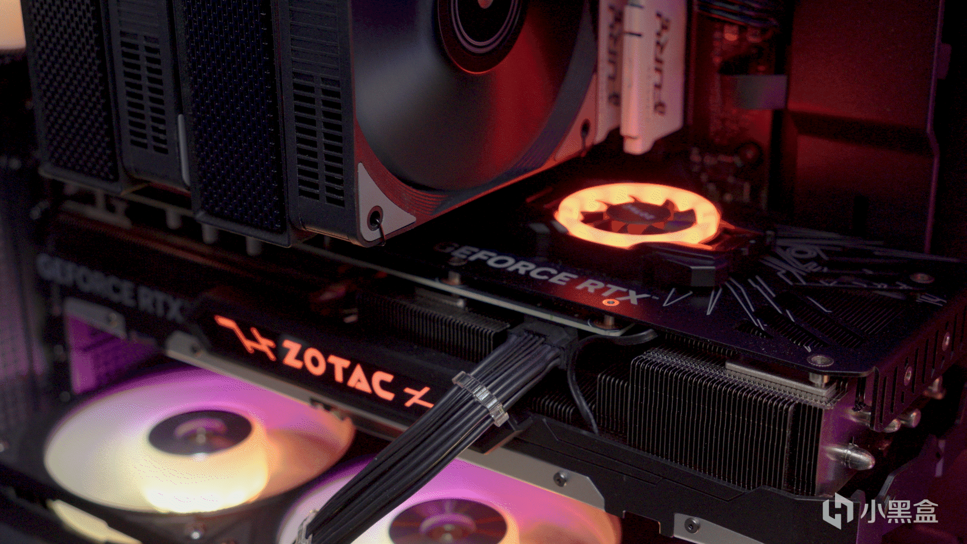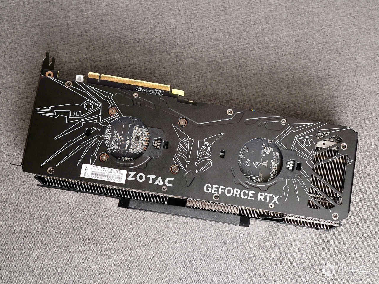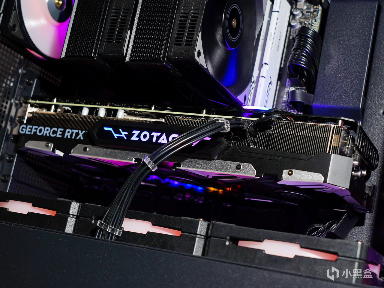 ▼显卡厚度基本为3槽,侧面中间的索泰“ZOTAC”部分也具有ARGB灯效。