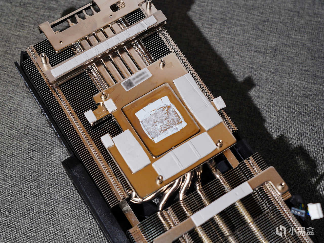 ▼在散热方面,和核心接触的底座为纯铜材质,并进行了抛光处理。用5根复合热管,其中一根热管程U型返回核心部分。