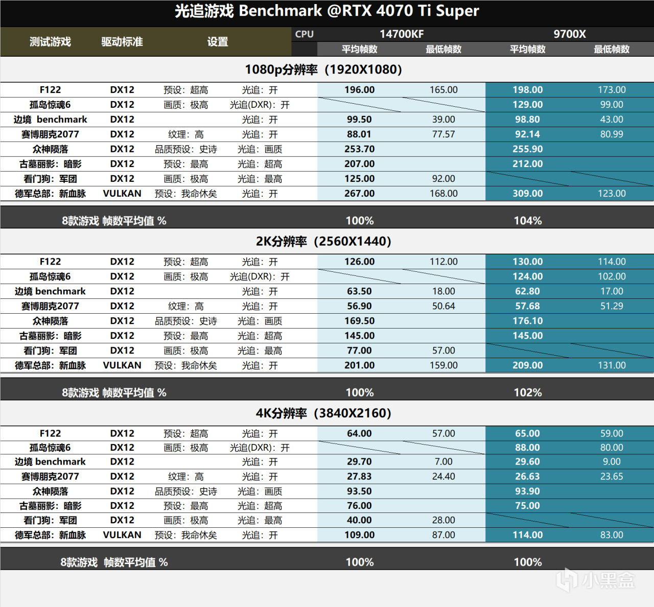 ▼到了2k分辨率下,除了赛博朋克2077稍稍低于60fps,其它游戏的流畅度不成问题,到了4k分辨率,一些对显卡要求比较高的游戏就有点扛不住了,来到了60fps以下。和光栅游戏的情况类似,9700X在1080p和2k分辨率下的表现要稍稍好于14700KF。