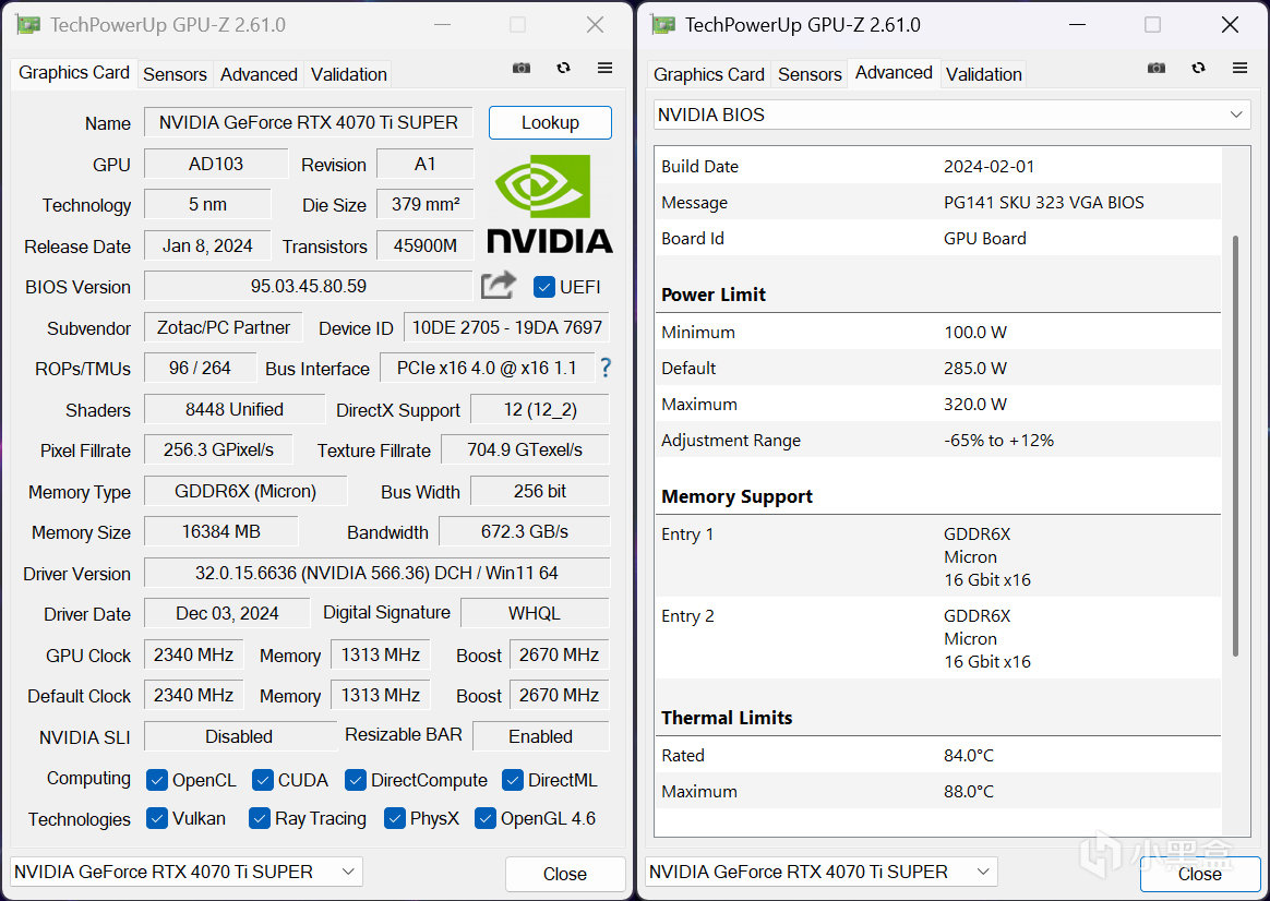 ▼显卡的具体型号是索泰RTX 4070Ti SUPER天启OC,Boos频率为2670MHz,显卡预设功耗为285W,最大功耗为320W。
