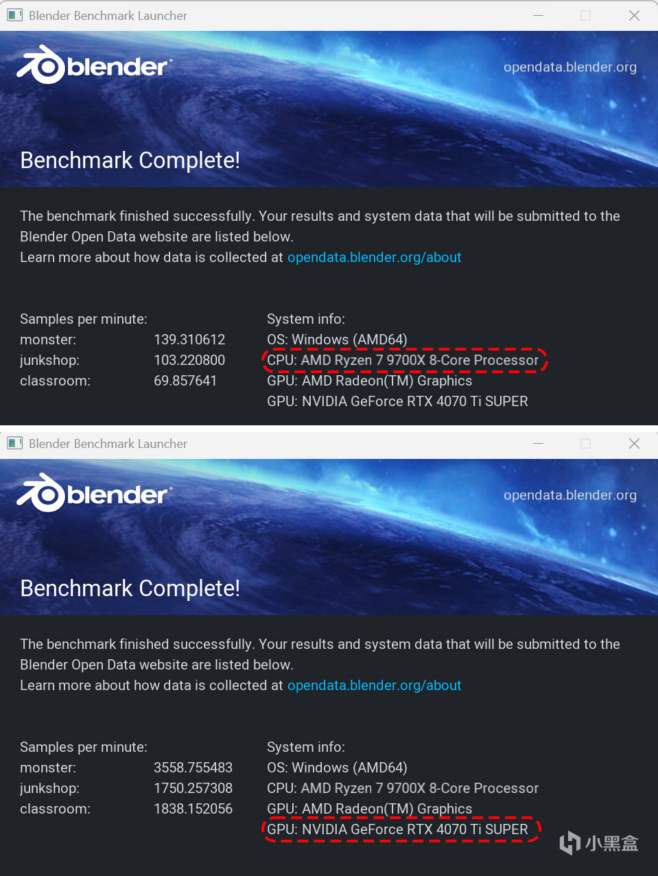 ▼Blender是一款开源 3D 创建套件。它支持3D 建模、动画、视频编辑等诸多功能。进行monster、junkshop、classroom三个场景的渲染测试,使用RTX4070Ti S(GPU)取得的成绩是使用9700X(CPU)的20多倍,差距真是非常巨大。