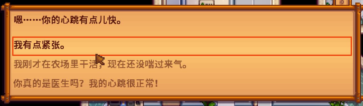 选择“我有点紧张”、“我刚才在农场里干活,现在还没喘过来气”+20好感度