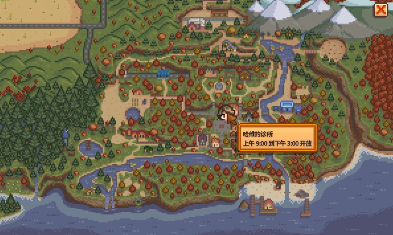 哈维的诊所位于小镇广场,皮埃尔的杂货店旁边,诊所只在每天9:00-15:00开放,而他居住在诊所的二楼,这意味着你无法在下午3点之后进入哈维的卧室/诊所。