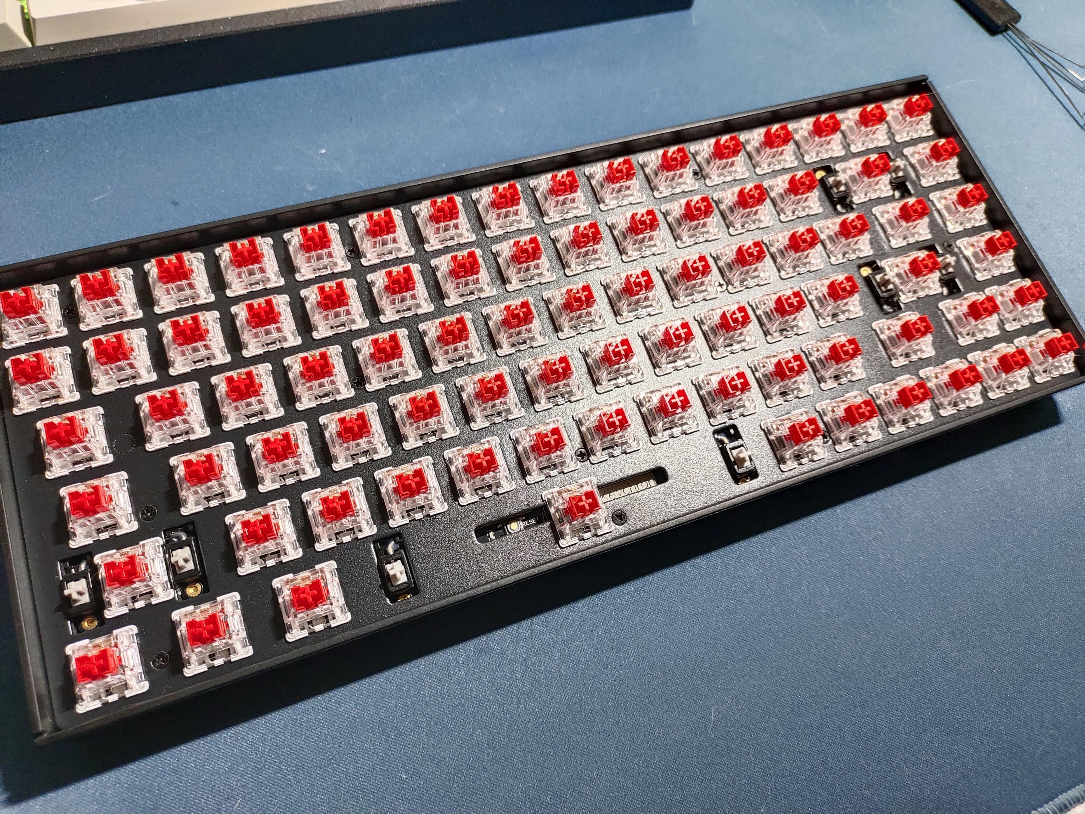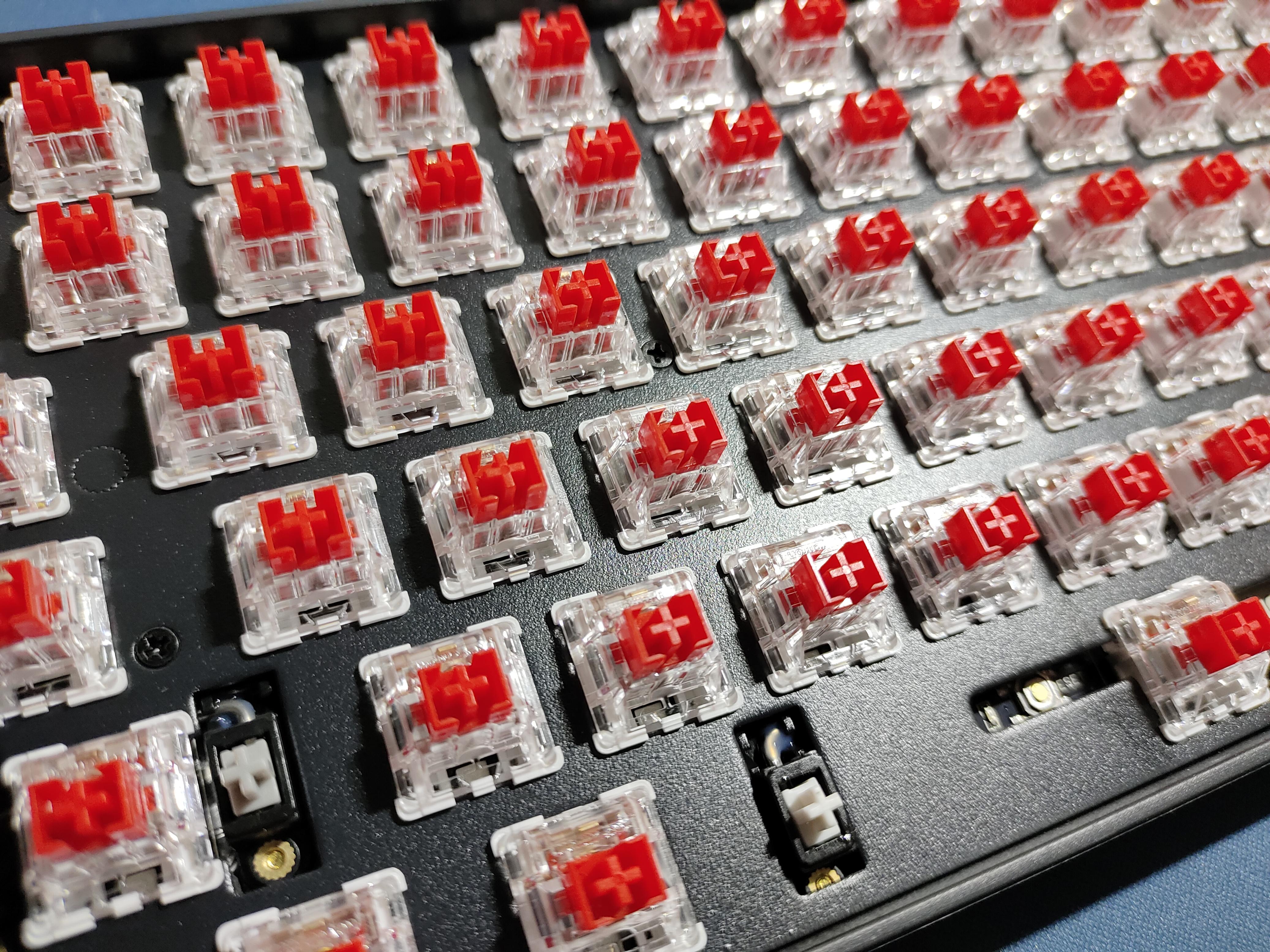 整把键盘的螺丝位都在键盘的定位板上。拆卸键帽后就会露出键盘本身的面貌可以看到键盘是一个经典的船壳结构键盘,螺丝较多,内部链接稳定,可以说是为了84配列携带方便稳定所做的妥协。