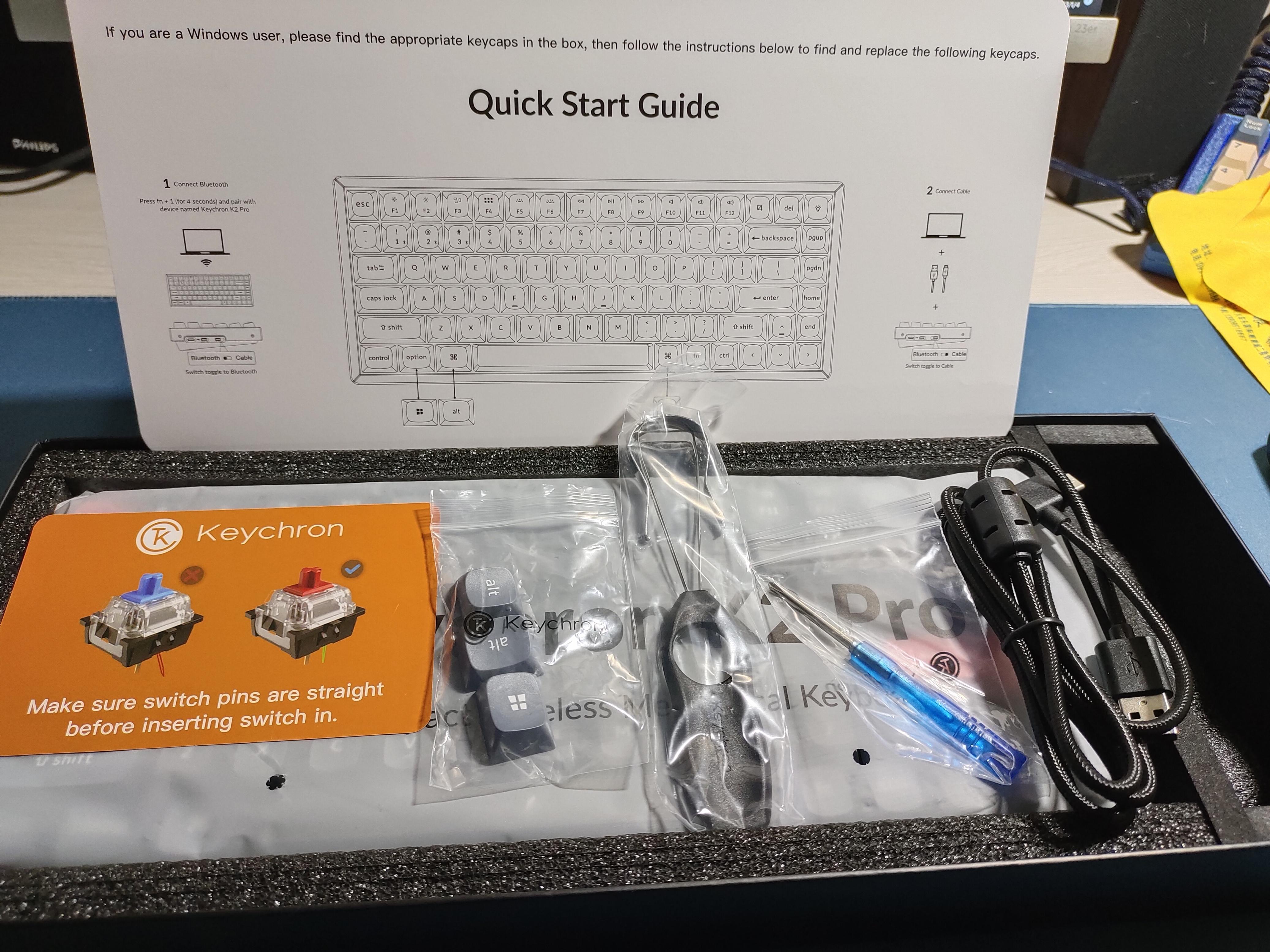打开后可以看到内部有一个产品的全英文链接说明和快捷键指南,一个轴体种类的示意卡片,三颗win模式的替换按键,一根专门的弯口数据线和键盘的拆解装备——螺丝刀,拔轴器,拔键器。