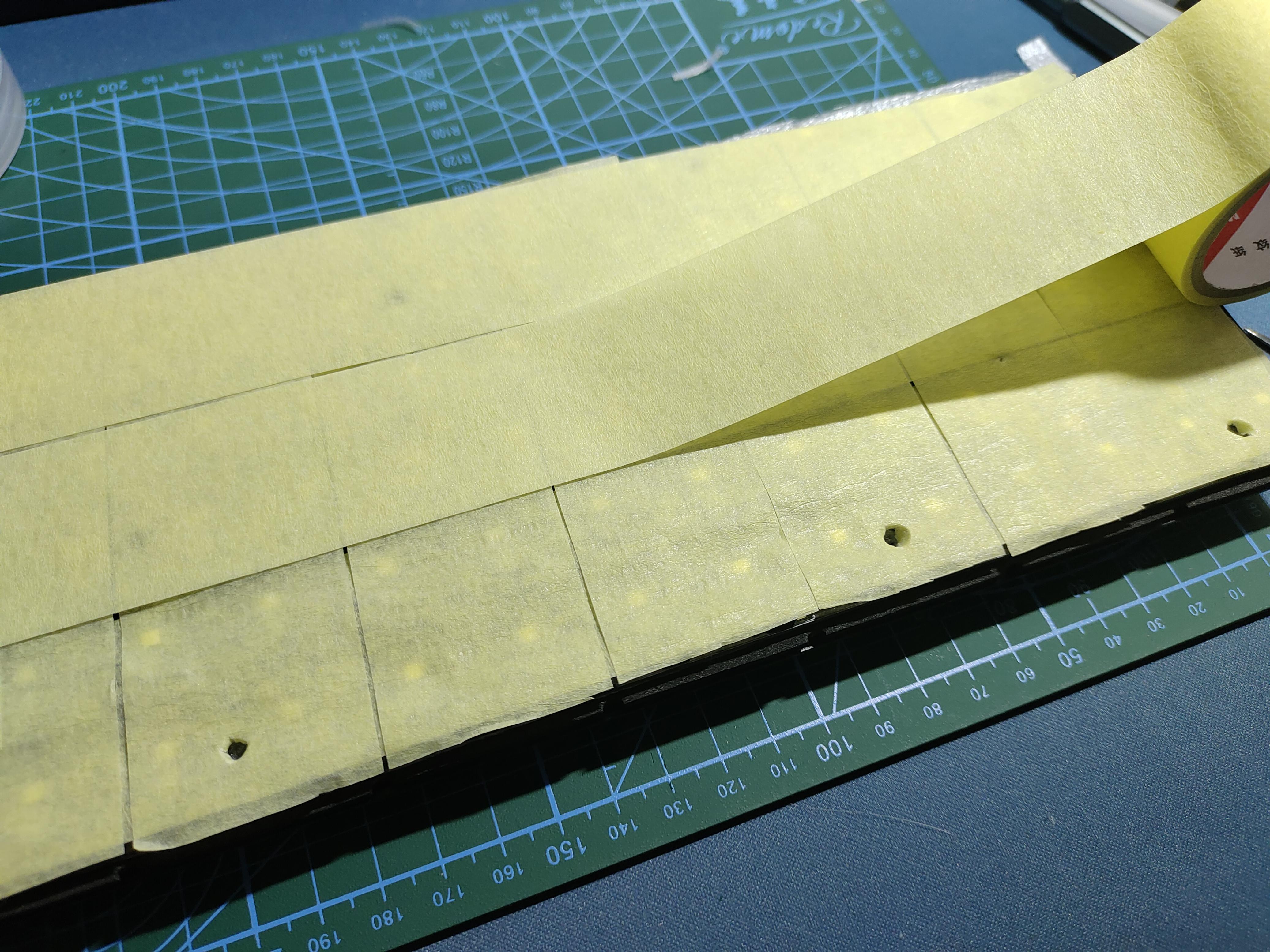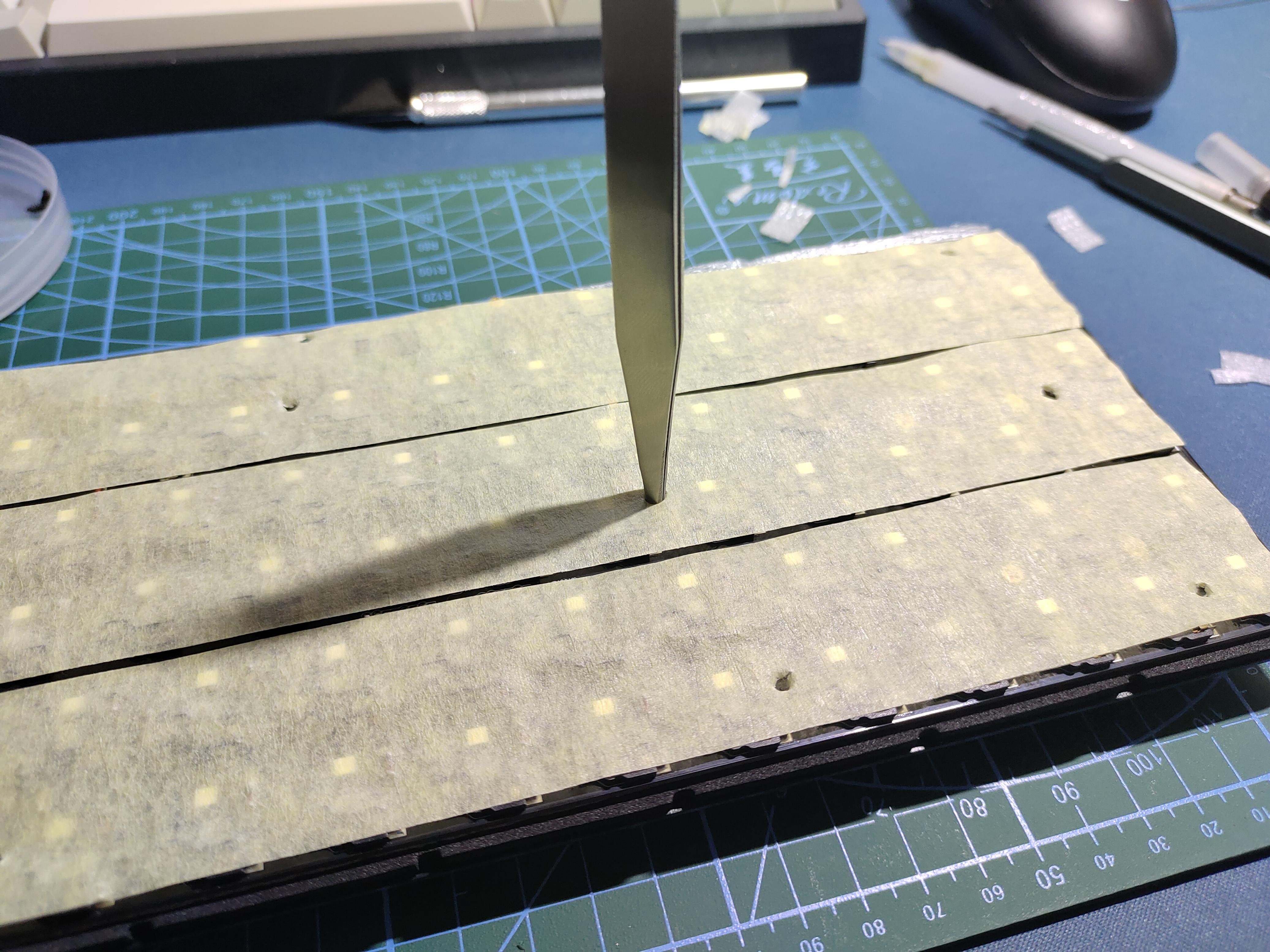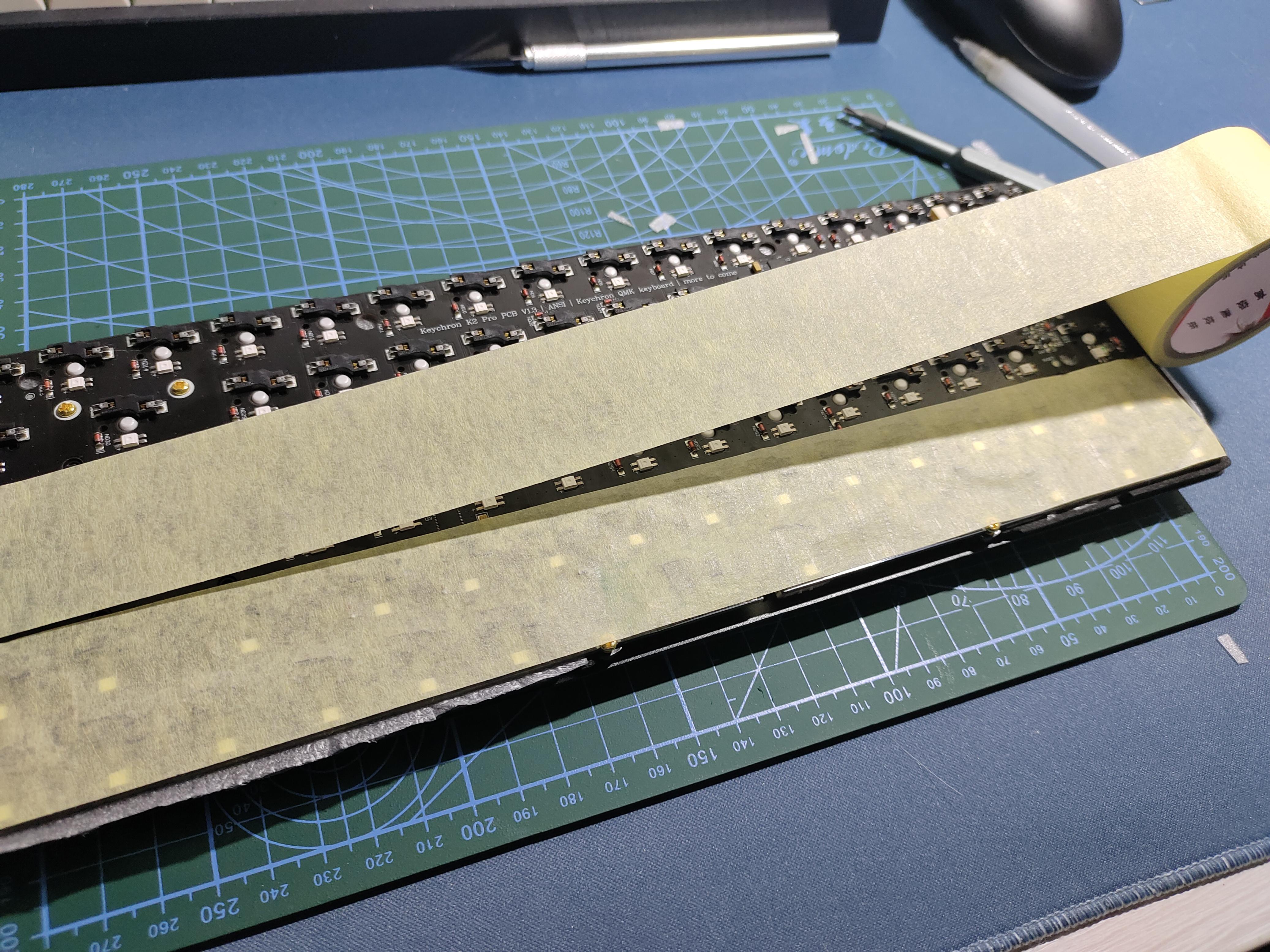 总共贴了三层美纹纸,但实际上厚度已经有点厚了,上螺丝时可以看到有些形变,但是这款键盘螺丝多,所以不是很在意这方面问题。