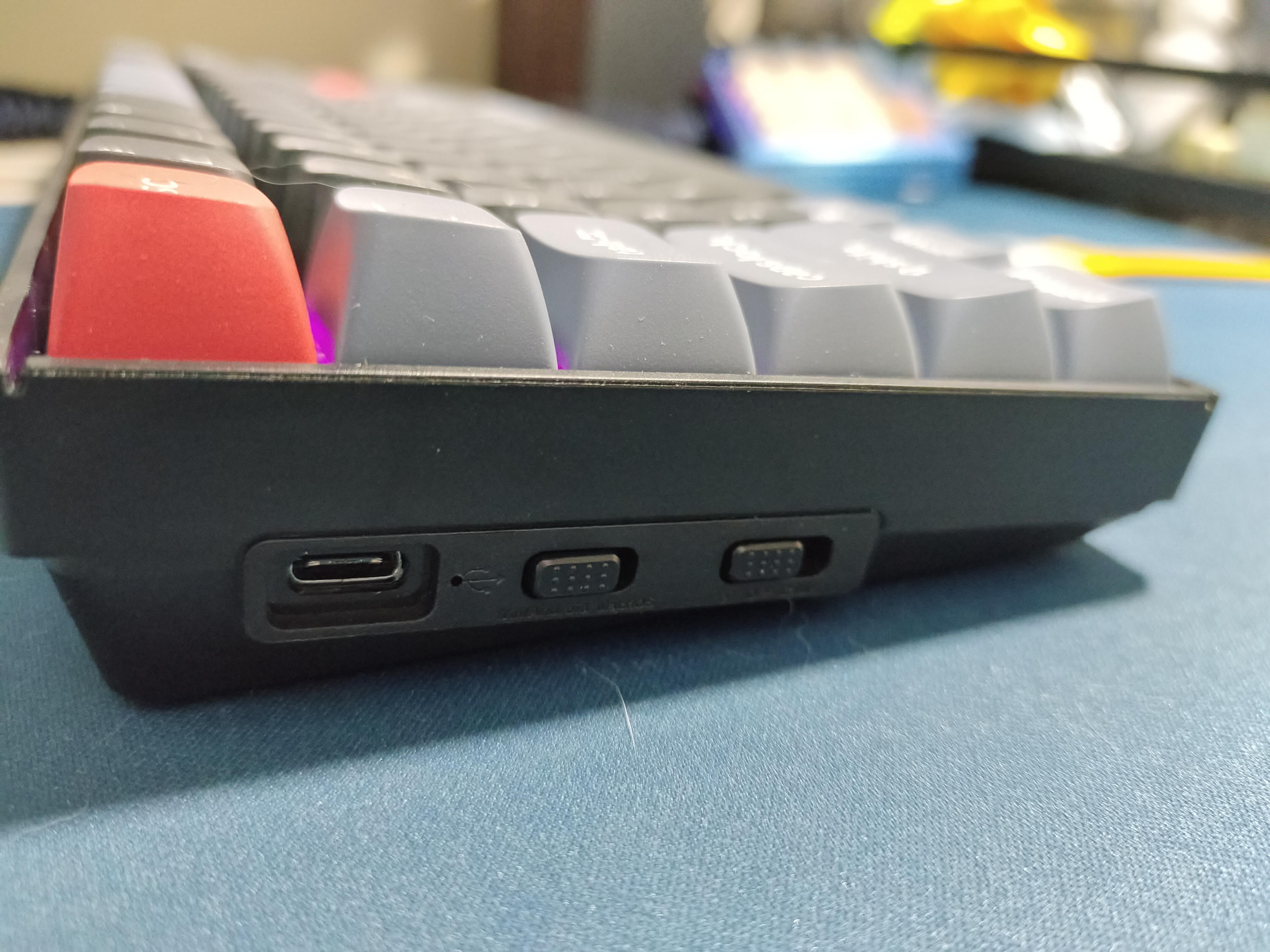 键盘的左侧是整个键盘走线以及开关的位置,可以切换mac和win模式(出厂是mac模式)旁边是有线蓝牙模式的切换。上部的usb-c接口链接自带的L头数据线走线会更适合电脑放在眼前的mac使用人群。但是由于线材仅有一米,所以电脑在右侧的用户可能还是得使用其他数据线。
