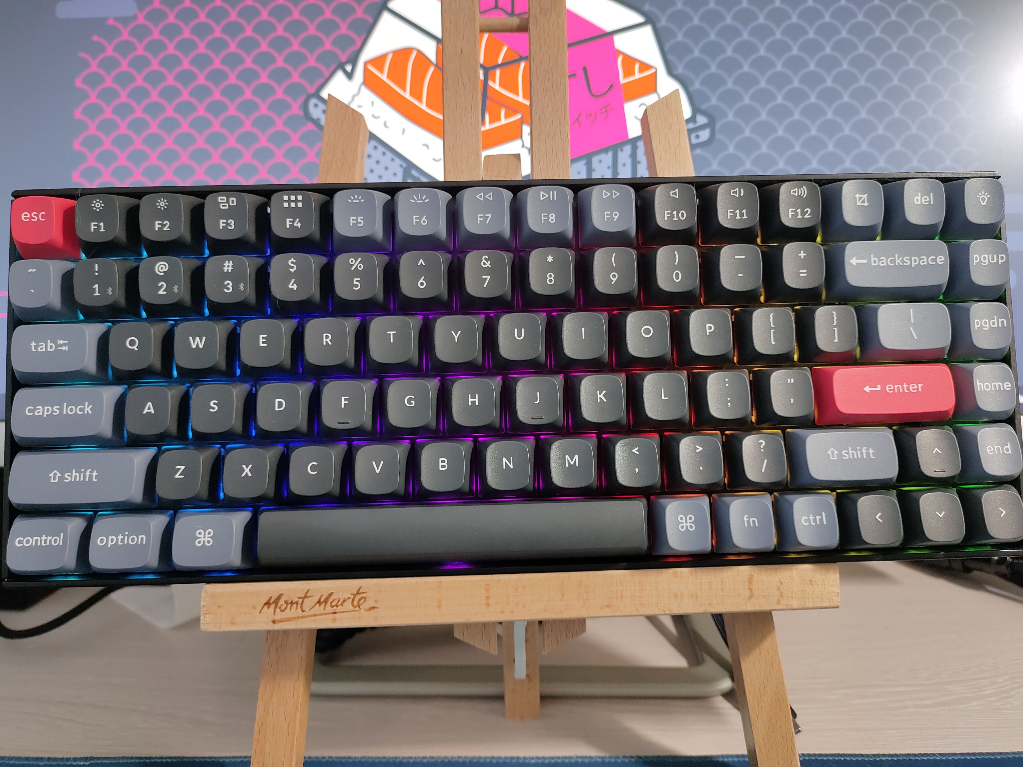 接下来就是键盘本体了,黑色的字母区和灰色的mod区点缀,红色的esc和回力更为画龙点睛,f区的字母上有着苹果电脑的快捷键图标,颜值和功能性上都有兼顾。一看就是一款经典的商务键盘。