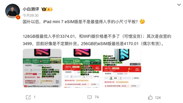 不过托尼还看到一个消息,可能 iPad mini 7 eSIM 版,才是这次平板国补的版本答案。。。但就是这个要凭运气和手速,反正托尼去看的时候,基本是无货状态。