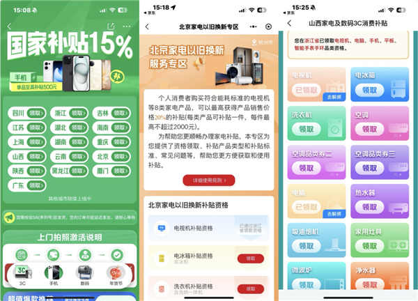 首先是参与方式,用户可以通过京东、淘宝还有抖音等 APP 找到 “ 政府补贴 ” 专区,领取对应品类的优惠资格。