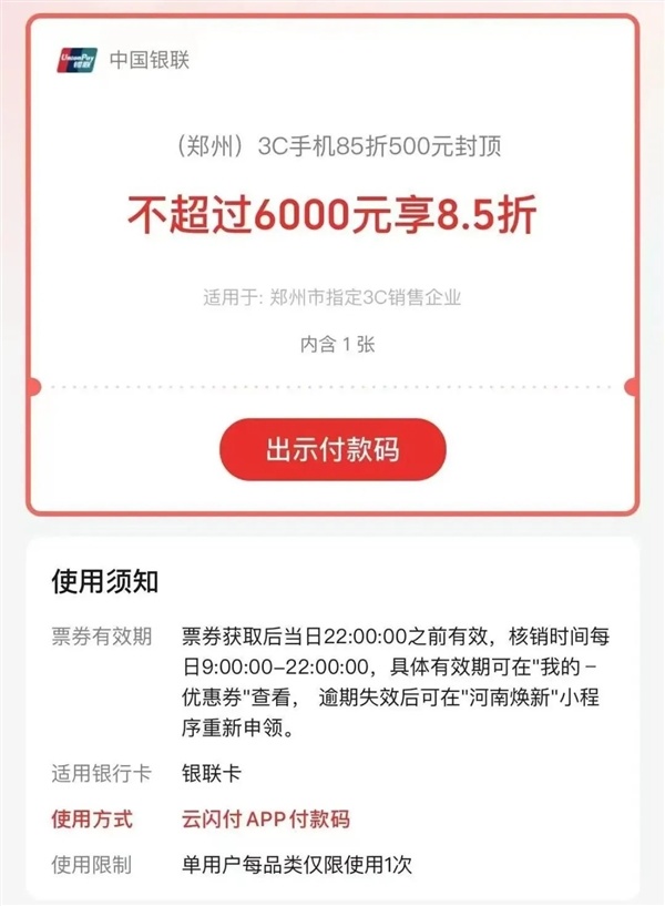 说完了线上领取国补资格的部分,托尼还注意到,有些省份存在线上渠道还没有开放,需要去线下门店购买机器的情况,或者干脆发的是云闪付的付款码,必须刷线下的国补专用 pos 机,或者等系统调试才能用。