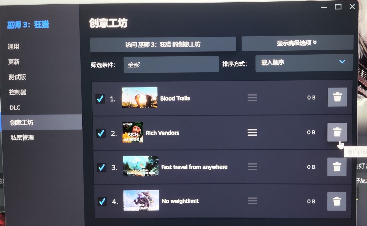 3. 提示訂閱完成後回到遊戲的主頁面,點擊右側的齒輪選擇【屬性】-【創意工坊】查看自己下載的 MOD 是否可以正常啓用。若要關閉已經下載的 MOD,可以點擊 MOD 左側的藍色對鉤來取消 MOD 啓用,再次點擊方框出現藍色對鉤則代表啓用。