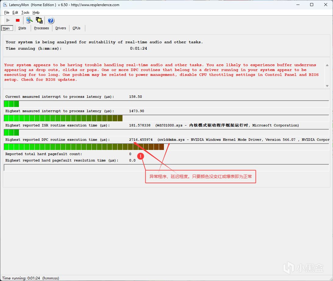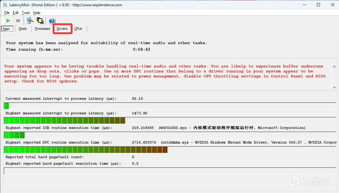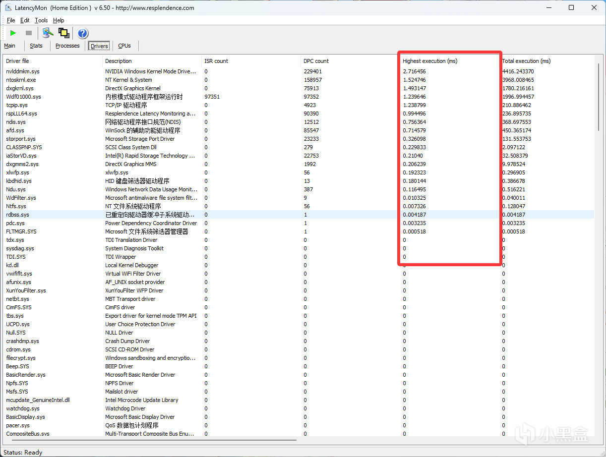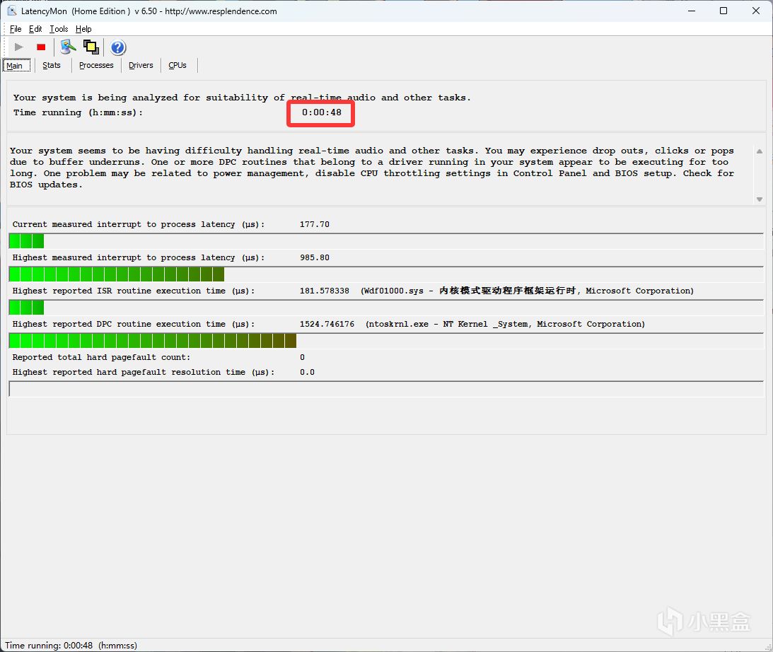 3.使用LatencyMon软件(CPU中断检测软件)检测到ACPI.sys(电源管理系统程序)或storport.sys(硬盘驱动程序)异常项。