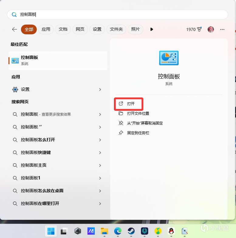 打开开始菜单,在搜索一栏中搜索控制面板。