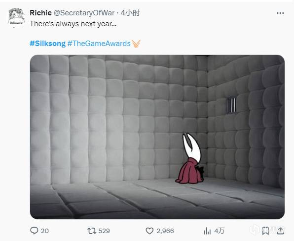 整体来说,《空洞骑士:丝之歌》对于很多玩家们来说或许已经成为了一个精神寄托。不出心心念念,拖得越久越让更多代餐提高了《丝之歌》游戏本身的含金量。而这份压力是否能够在游戏再次公布实机演示得到释放,今年或许我们真的真的可以看到答案,在座的诸位,你们还期待着么?
