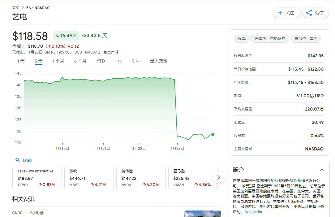 EA股价大幅度跳水,股价暴跌超16%,市值蒸发近60亿美元