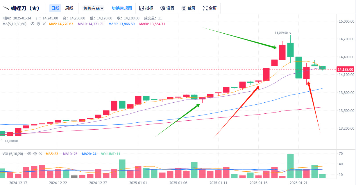 舉例:(蝴蝶刀op)下來1萬4的位置到13800左右我不會責無旁貸的去進場,這個位置是一個底並且很多人的心裏底部也在這裏,所以我不跟隨大衆的想法在這個位置去做一個承接,而是選擇比13800的價格偏高或偏低的時候進。當然這也只是我自己的的一些對市場的看法,並不是百分百準確但是一定有用,希望各位也能清楚去摸索市場的信息。