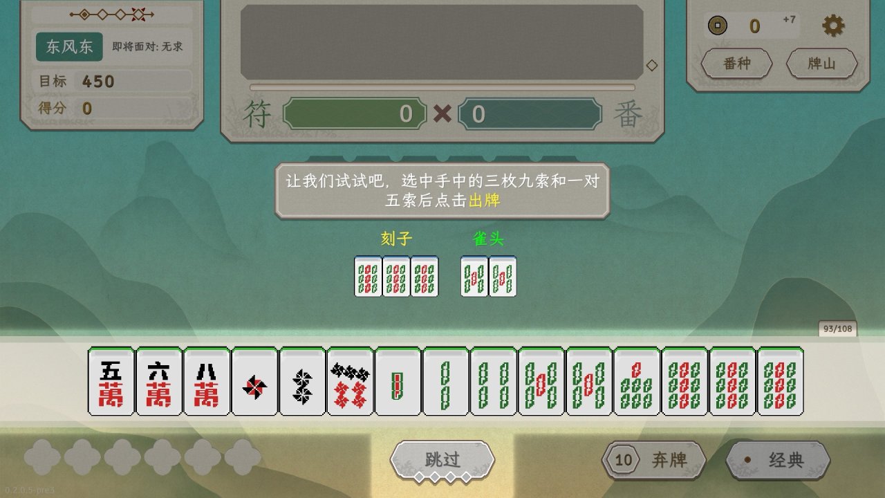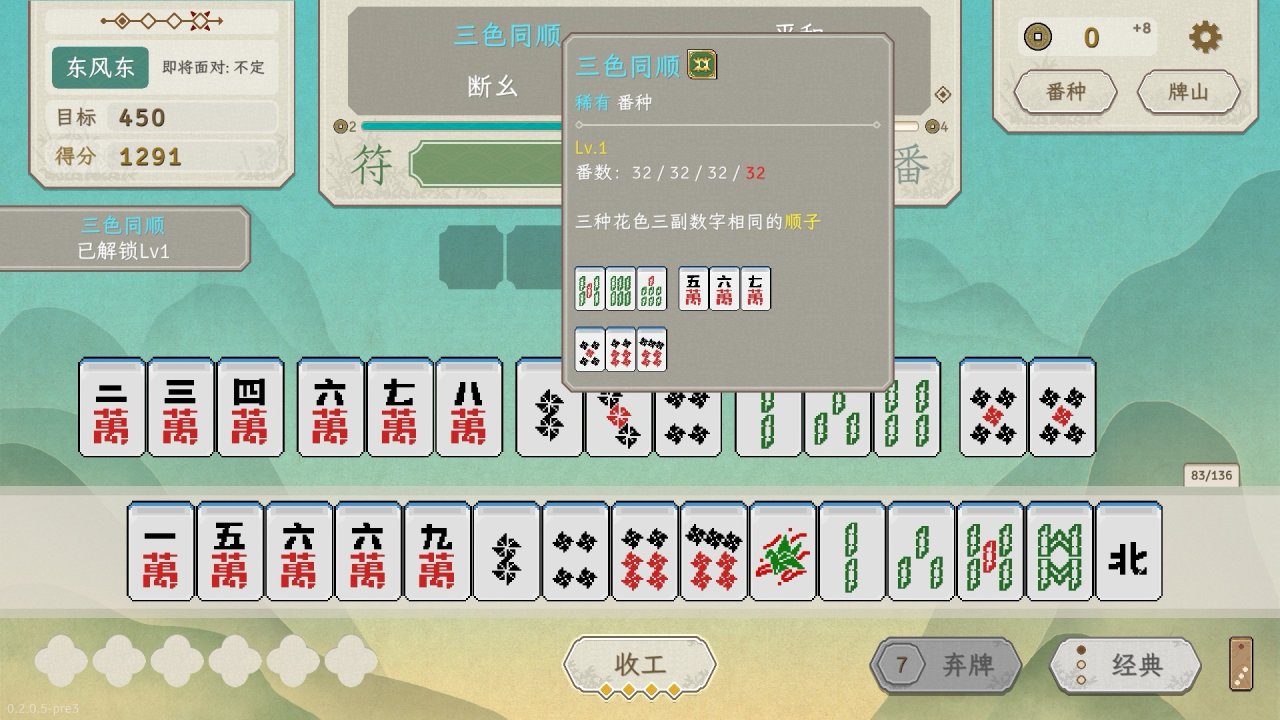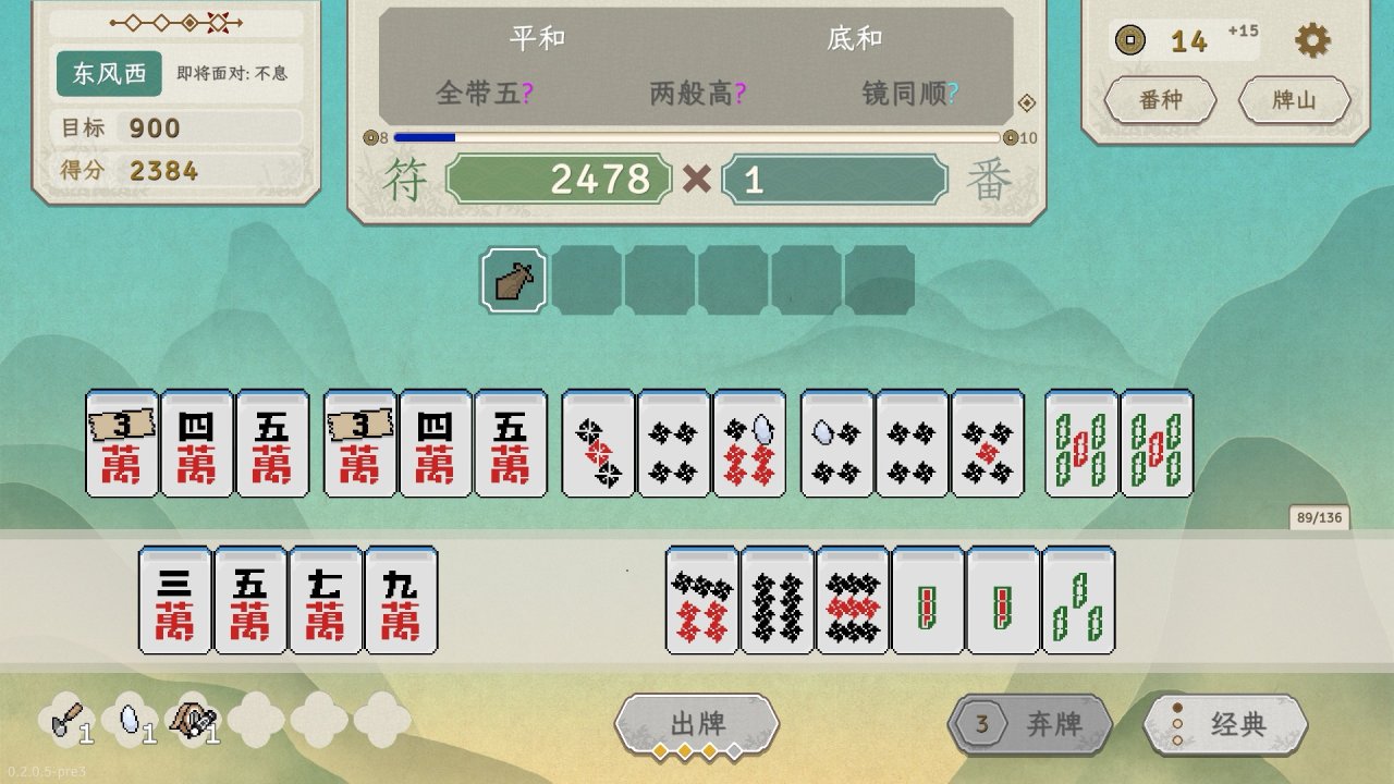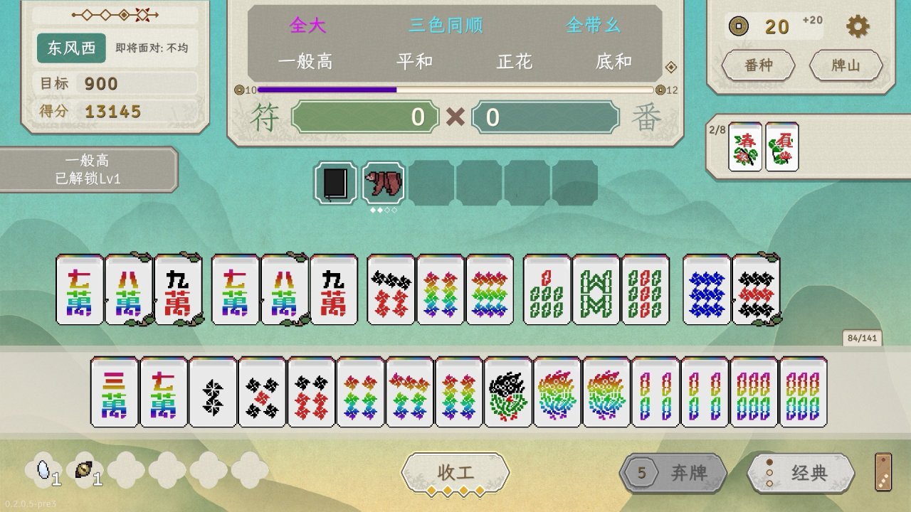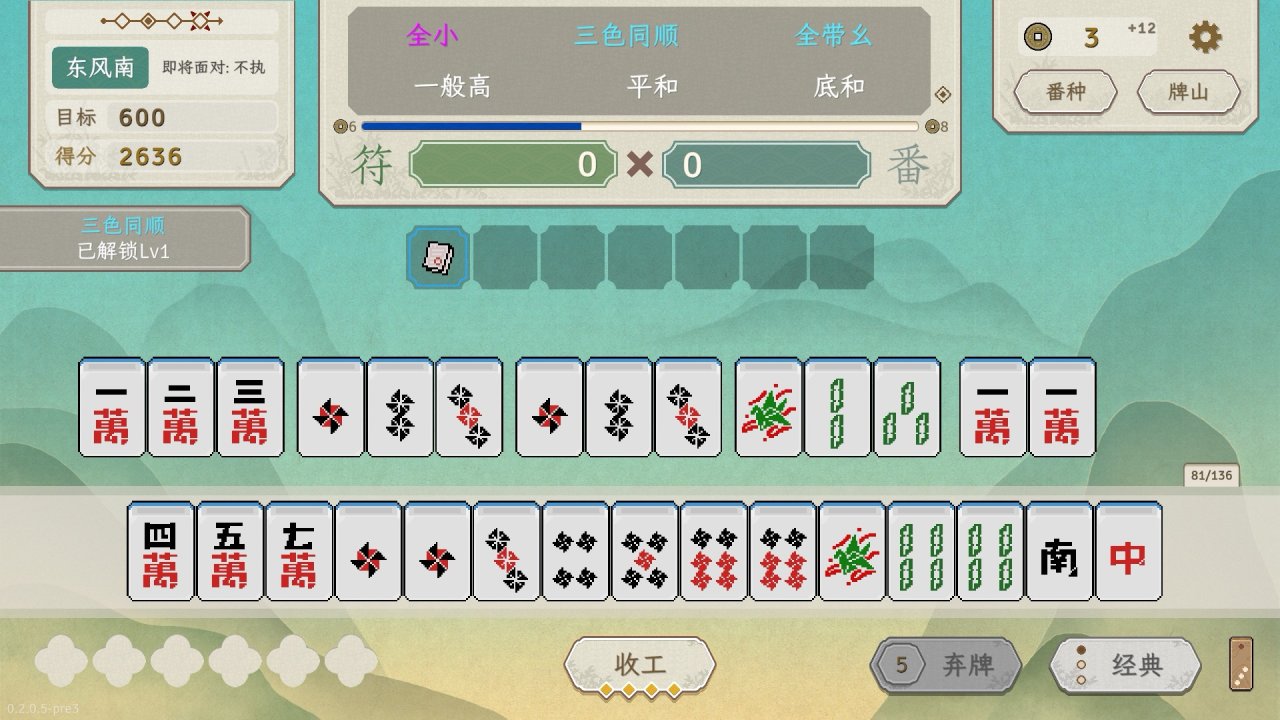 还是要简单介绍一下《青天井》的出牌与分数计算方式,以免后续介绍更加让人不知所云。玩家每次出牌需要三张麻将组成的面子(包含顺子与刻子),以及两个相同麻将组成的雀头,面子与雀头组成了分数中的“符”;游戏中共需四次出牌,第四次出牌时的雀头与四次出牌的面子一起组成了最终牌型(番种),这个牌型也就决定了分数中的“番”。符*番即为最终分数。出牌四次是最常见的经典出牌方式,你也可以选择只出牌一次的七对、十三幺(国士无双)这两种特殊出牌方式。