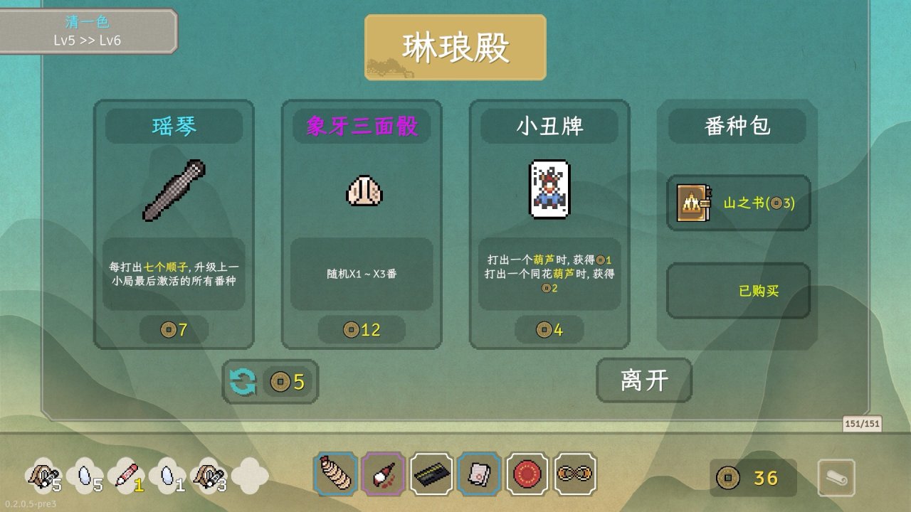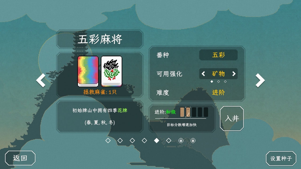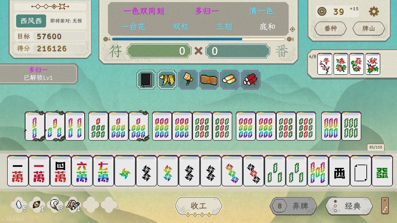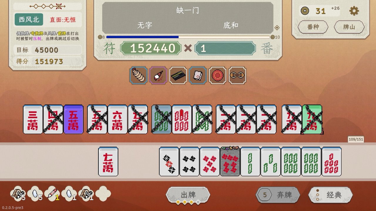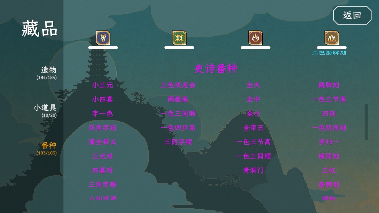 当然,以上这些只是《青天井》最基础的玩法,有了肉鸽的加持,《青天井》才是这个让我三天爽玩十二小时的单机麻将游戏。游戏中除了经典的绿色和蓝色麻将之外,也有拥有各种花牌玩法的五彩麻将以及特殊玩法的竹骨和银河麻将。包含矿物或者魔物等等的几种麻将类型,一百多种遗物让玩家组建构筑,再加上之前提到的牌型数(番种)同样过百,所以我游玩时很少使用相同的套路,新鲜感一直在。