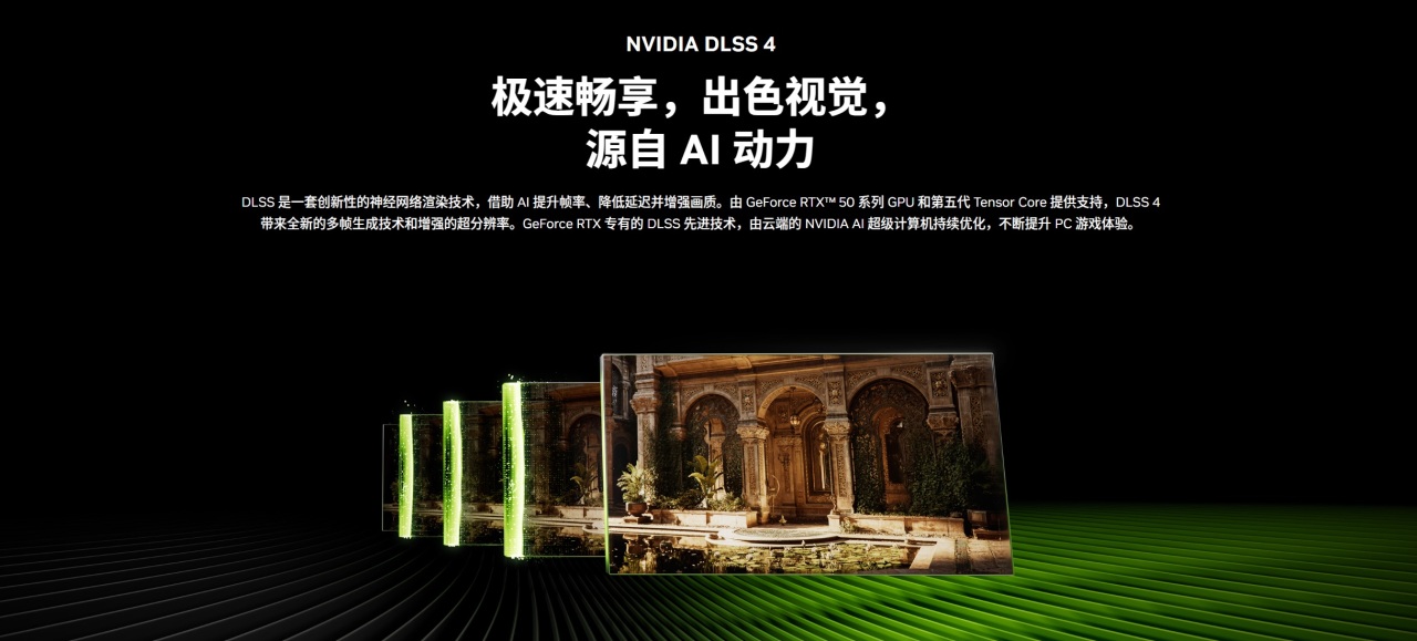 耕升 GeForce RTX 5090 D 踏雪支持多項NVIDIA RTX技術,新增了全新的DLSS 4、光線追蹤技術、Reflex 2技術等。DLSS 可通過降低渲染分辨率並藉助 AI 算法提升圖像質量,從而顯著提升遊戲幀率、降低延遲並增強畫質,使得遊戲在更高分辨率後光線追蹤模式下也能流暢運行。全新的 DLSS 4由 GeForce RTX 50 系列和第五代 Tensor Core 提供支持,利用 AI 可爲每個渲染幀額外生成最多 3 幀,從而進一步提升幀數。DLSS 4 帶來全新的多幀生成技術和增強的超分辨率,基於加入了全新的 Transformer 架構,可以更加提升畫面的穩定性,減少僞影,增加細節並增強抗鋸齒效果。將有超過 75 款遊戲和應用支持全新的DLSS 4,玩家將能享受到更多DLSS 4 幀生成技術所帶來的非凡性能提升!此外,NVIDIA Reflex 2可幫助玩家降低系統延遲,更快的提升遊戲中的響應速度,特別適用於競技遊戲。