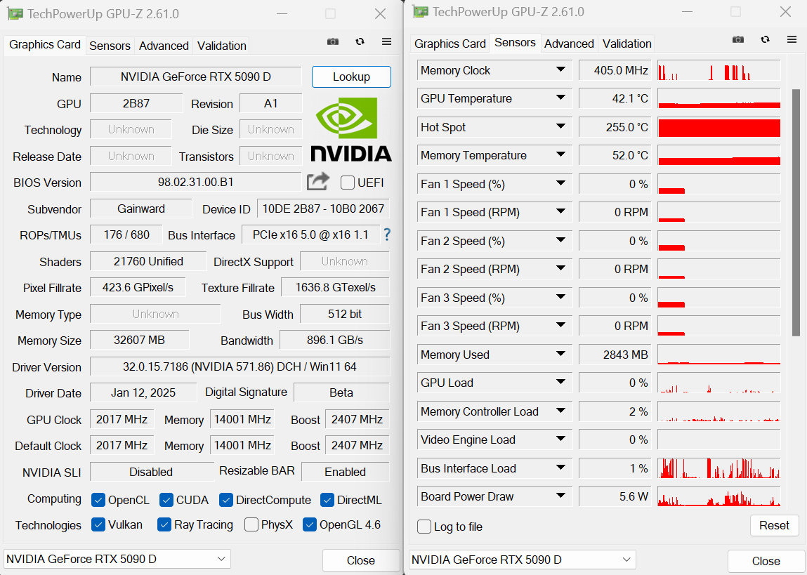 由檢測軟件GPU-Z可看到耕升 GeForce RTX 5090 D 踏雪具體的參數表現和實際規格。通過數據可以看到,在待機狀態下,顯卡溫度爲42.1℃,功耗爲5.6W。