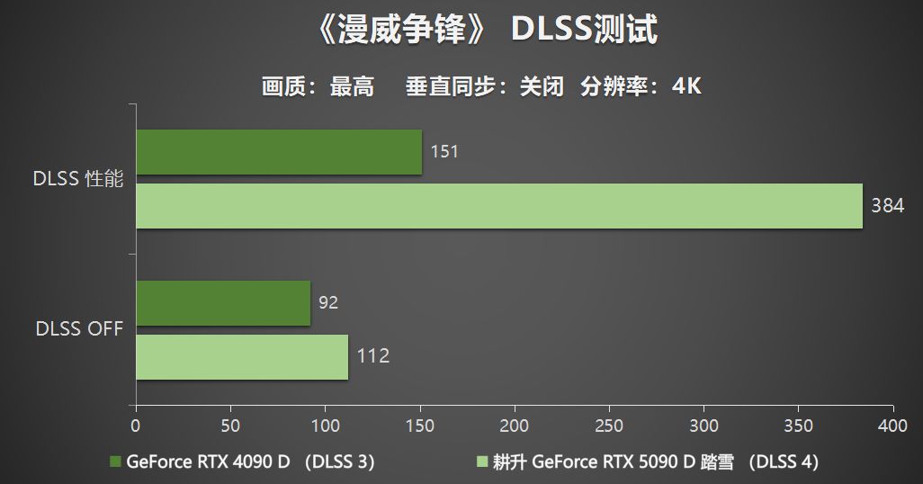 在4K最高畫質下,GeForce RTX 4090 D在DLSS 3性能模式中擁有151幀的表現,而耕升GeForce RTX 5090 D 踏雪在DLSS 4性能模式下,其幀數高達384幀,在遊戲過程幾乎杜絕了任何卡頓與延遲等現象,爲玩家帶來極致暢快的競技體驗。