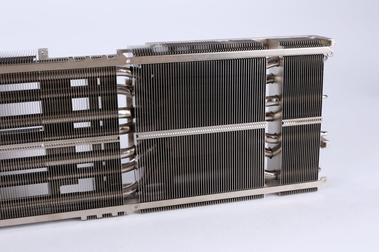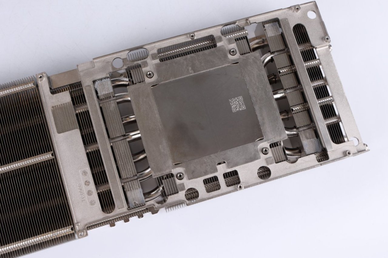 散熱方面,顯卡採用全新「雪魄」散熱器,該散熱器由合金加固中框組成,並加入了特大面積導流散熱鰭片,內建7根8mm複合式熱導管,複合式鍍鎳熱管和核心位置特設的VC均熱板,結合迴流焊接工藝,能夠更快的將核心溫度傳遞出去。同時,熱導管採用抗氧化的鍍鎳設計,爲顯卡的散熱效果和使用壽命提供了雙重保障,進一步提升整張顯卡的壽命和降噪能力,使其更具競爭力。