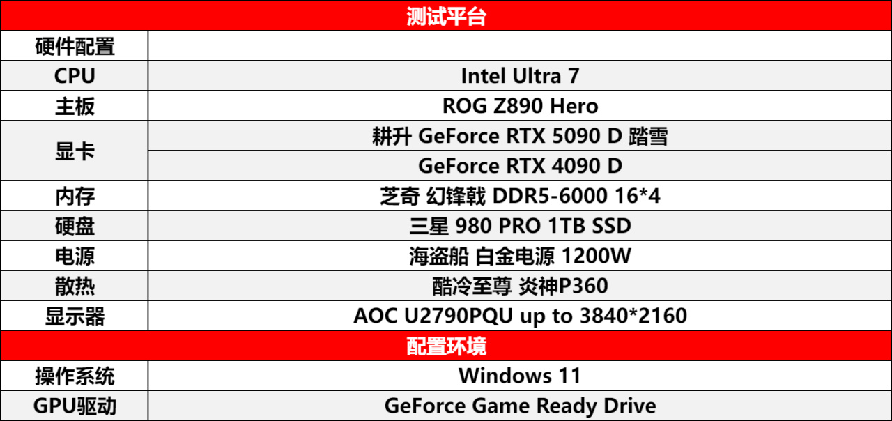 本次測試將採用以下配置:CPU選用了Intel Ultra 7,搭配ROG Z890 HERO主板,內存方面搭載了4條芝奇 幻鋒戟 DDR5-6000Hz 16GB內存條,電源方面則採用了海盜船 白金1200W電源,散熱部分則使用了酷冷至尊 炎神P360一體式水冷。這套配置足以讓耕升 GeForce RTX 5090 D 踏雪能在穩定的環境下最大程度發揮出超強性能。