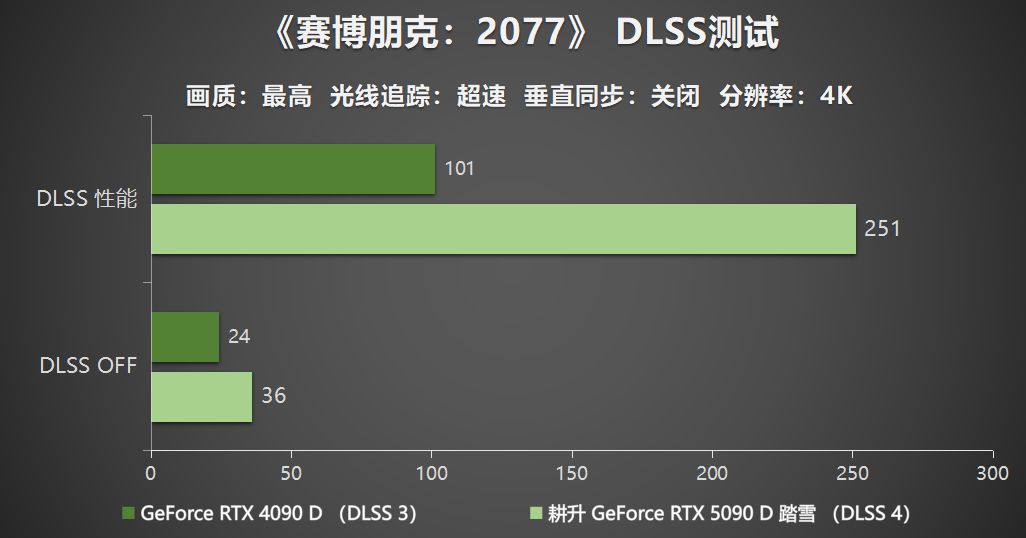 當將分辨率調整到4K,《賽博朋克:2077》對硬件配置的要求也相應增高。GeForce RTX 4090 D在關閉和開啓DLSS技術時,平均幀數分別爲24幀和101幀,可見DLSS 3帶來的性能提升約爲320.8%。而耕升GeForce RTX 5090 D 踏雪在DLSS 4技術的加持下,其性能提升漲幅約爲597%,在DLSS 4性能模式下進行遊戲,平均幀率可實現251幀。由此可見,在對硬件配置要求極高的《賽博朋克:2077》中,玩家使用耕升GeForce RTX 5090 D 踏雪可在高分辨率下享受高幀數的遊玩體驗。