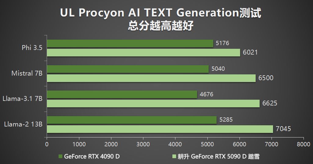 測試數據顯示,耕升 GeForce RTX 5090 D 踏雪在四項AI文本生成模型測試中均凸顯出其卓越的性能水平。在對硬件要求不高的Phi 3.5-mini-3.8B模型測試中,耕升 GeForce RTX 5090 D 踏雪無論是總分還是AI文本輸出速度,均較GeForce RTX 4090 D有20%的領先優勢。而在面對更爲複雜的Llma-2和Llma-3.1模型,耕升 GeForce RTX 5090 D 踏雪的性能表現更是領先GeForce RTX 4090 D近38%。結合四個模型的測試成績,耕升 GeForce RTX 5090 D 踏雪在AI文本生成性能上的出色表現,使其在四個模型測試中均顯著優於GeForce RTX 4090 D,尤其在生成速度和響應時間上表現出更爲明顯的優勢。