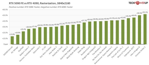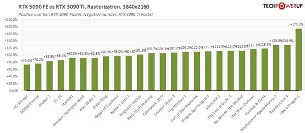 根據TPU實測,RTX 5090在4K分辨率下(不開光追和DLSS)的表現相當強勁,領先RTX 4090約35%,相較於RTX 4080 Super,它的性能提升了72%,是RTX 3090 Ti的兩倍多。
