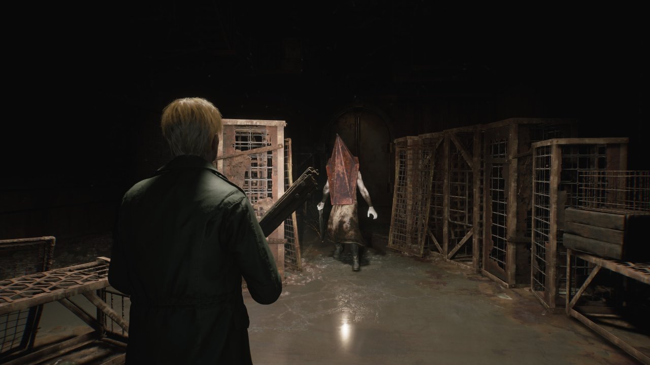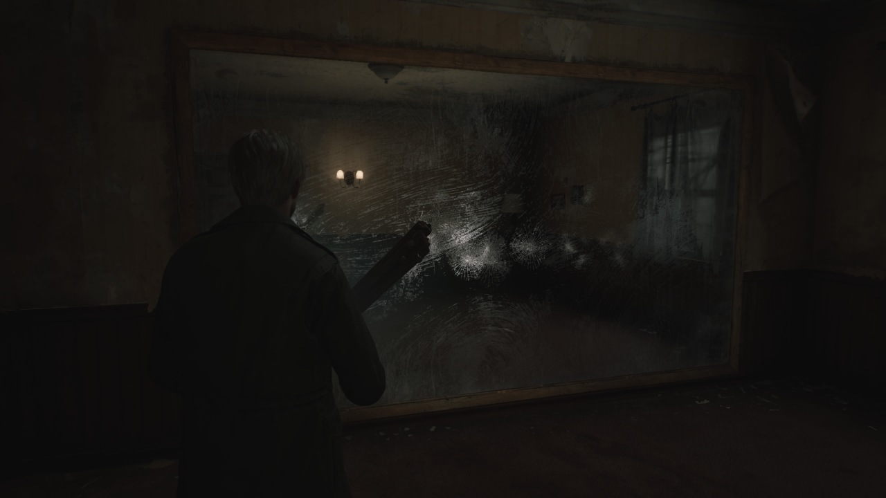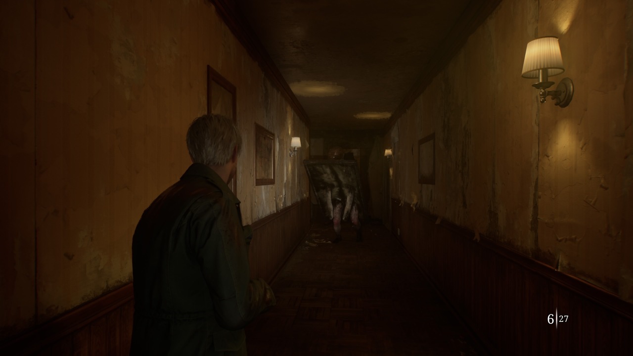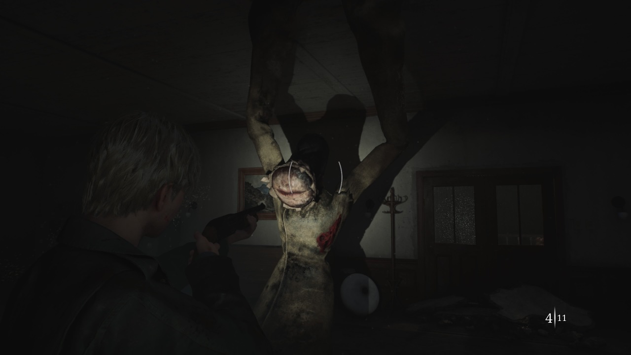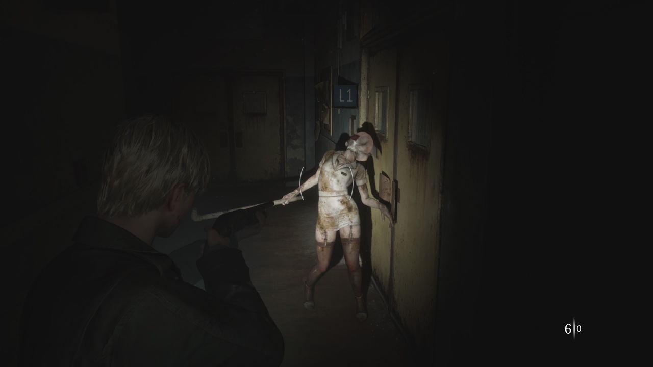 寂靜嶺2重製版的戰鬥體驗相較於關卡設計的高光就要遜色不少。武器彈藥和醫療品是遊戲唯二提供的戰鬥資源。沒有成長性的武器在戰鬥策略層面上也會比現代生化危機裏的系統要單調不少。同樣,也沒有除了常規武器以外如閃光彈和手雷等道具,收束了玩家應對敵人的方式。就我自己玩的標準難度而言,戰鬥資源的刷新和供給節點感覺不是很合理,經常有子彈和醫療品溢出的情況(在儘量全探索房間的情況下)。