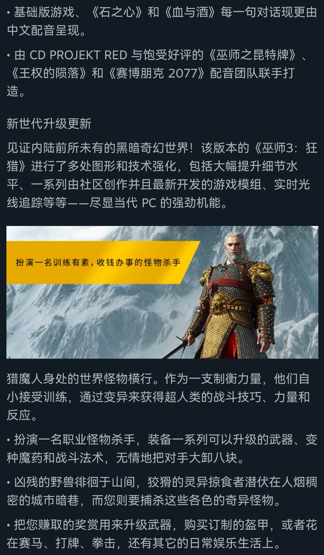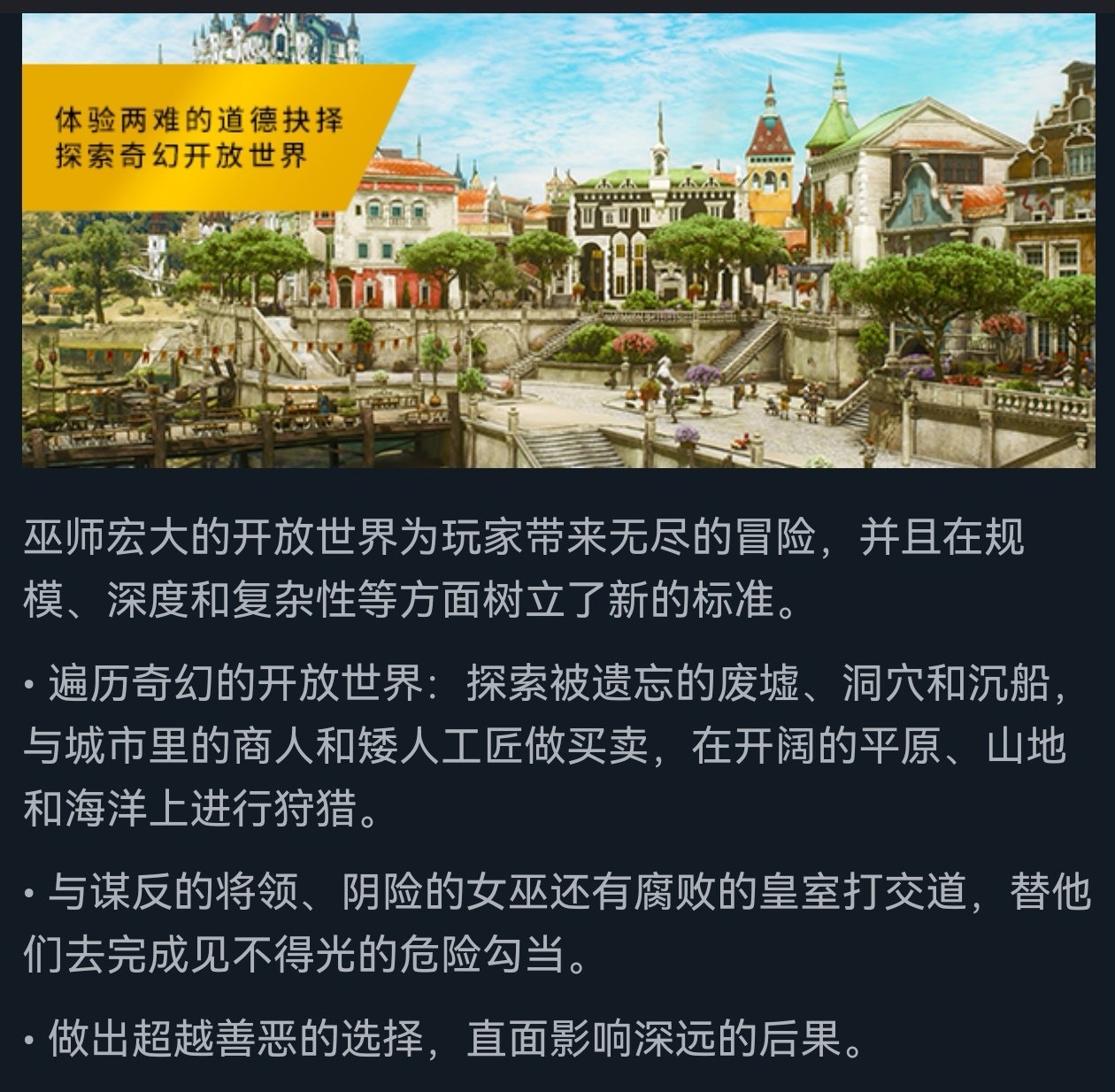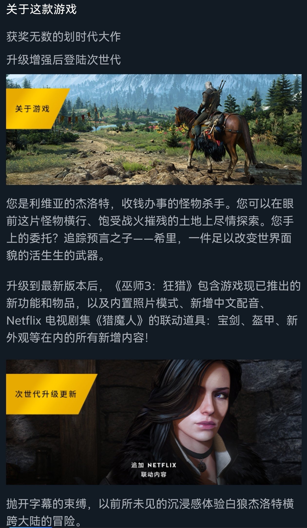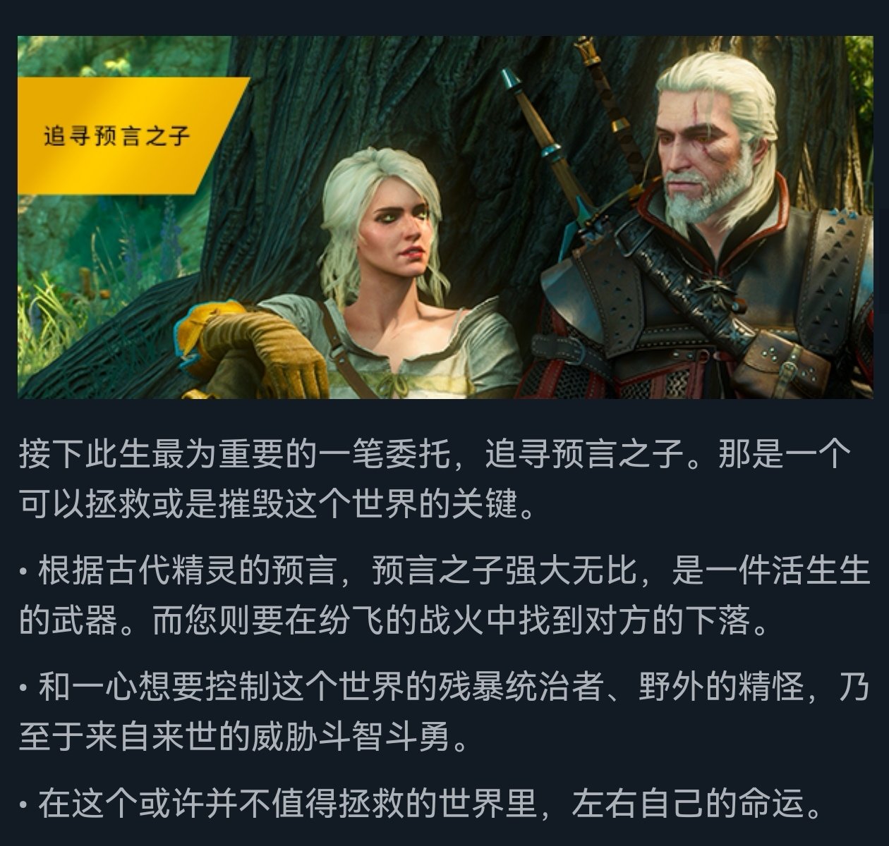 大家好,今天,来自波兰的CDPR公司给旗下的游戏开启了折扣,而该公司的代表作《巫师3:狂猎》迎来了折扣,年度版价格更是近几年的史低价格39.8元,还是很推荐入的,这是我通关的第一款3A大作,剧情以及风景都是很顶级的,音乐动人而深沉,游戏的昆特牌一样是很多人的最爱,体验杰洛特在这片大陆的故事,游戏最精髓的就是支线任务了,制作非常精良而且具有很深的思考价值。