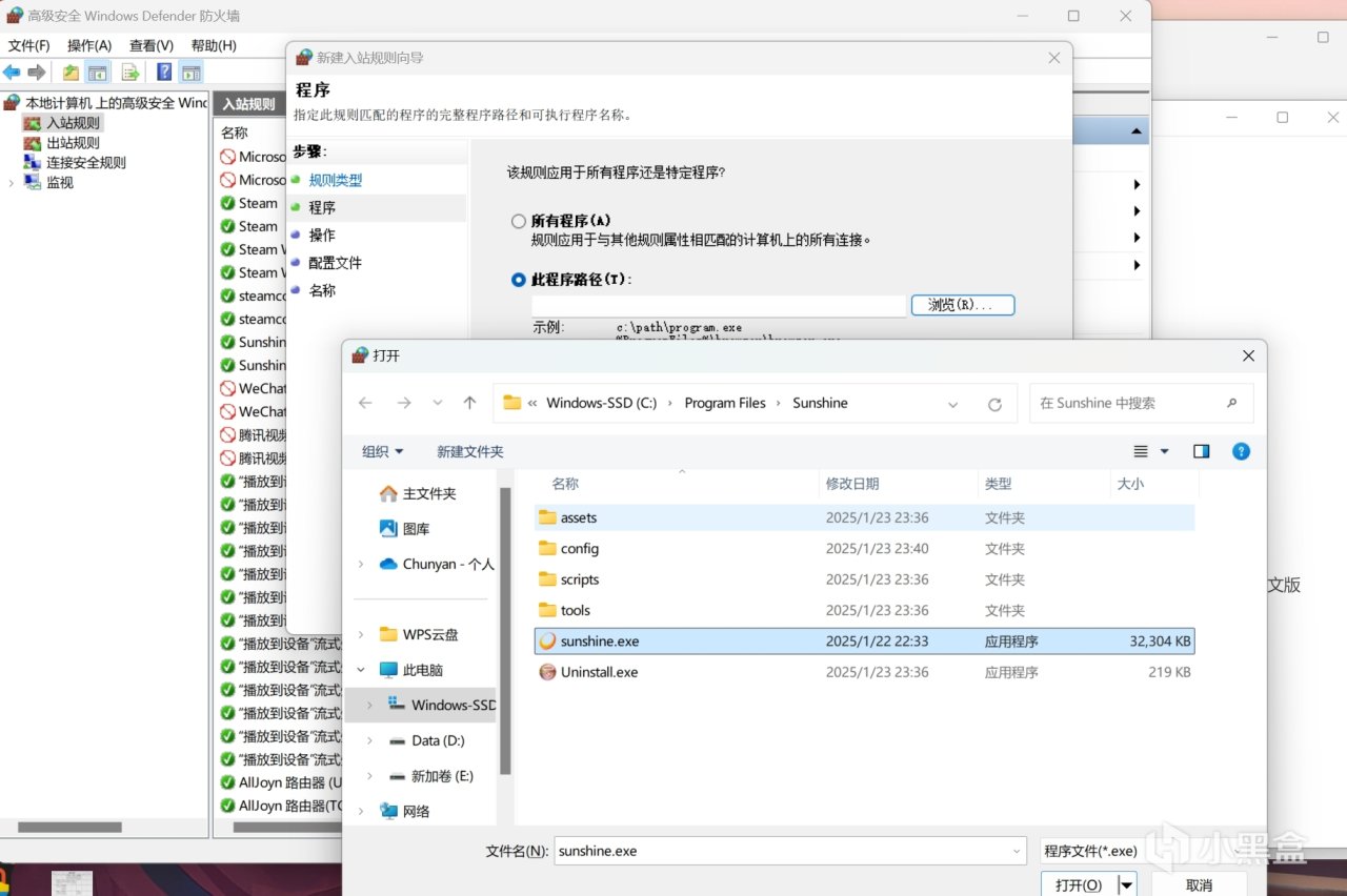 在防火墙高级设置中入站规则新建一个,选择程序,找到sunshine文件选择那个exe文件就行