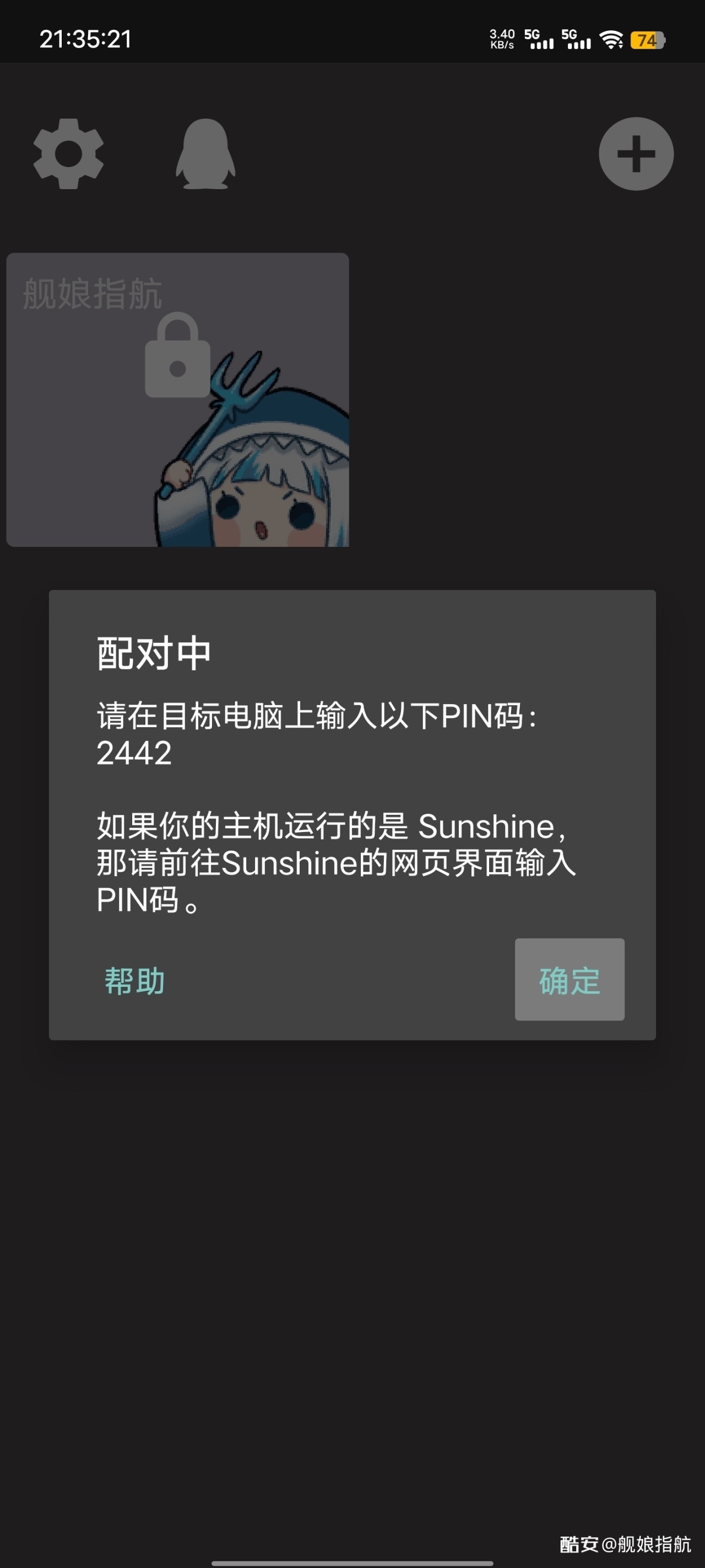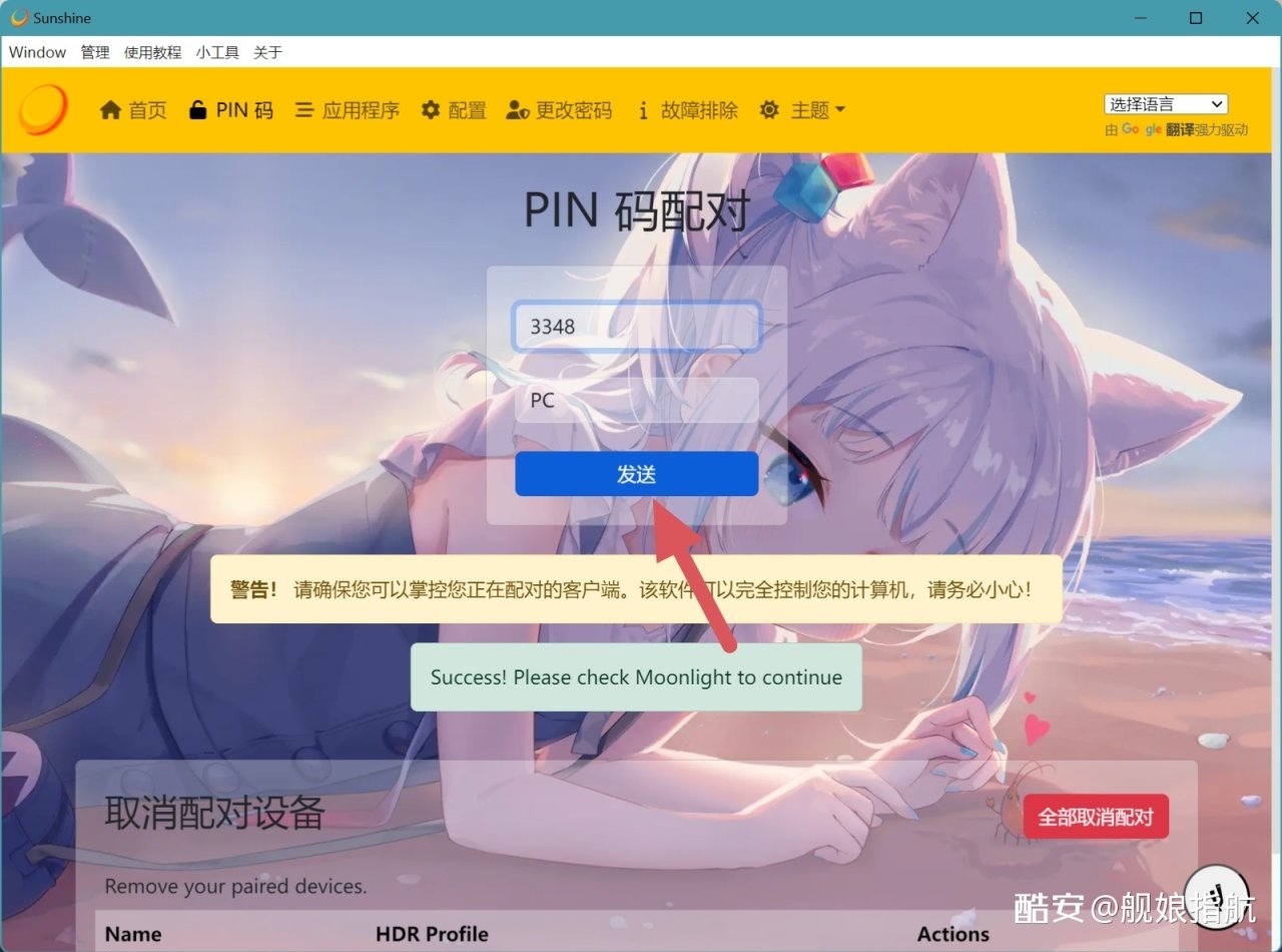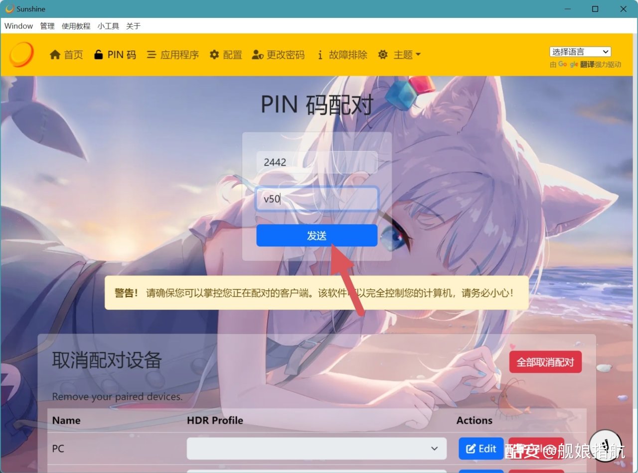 点击锁会弹出PIN码,将该PIN码输入到Sunshine的PIN码配对中再点击发送。