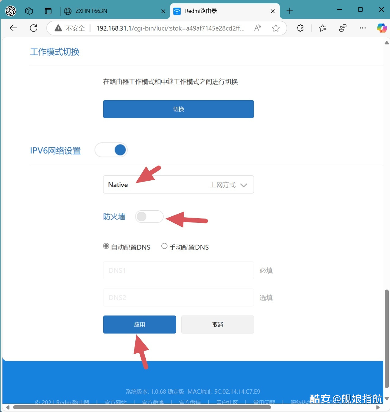 常用设置——上网设置——打开IPv6网络设置——选择Native方式——关闭防火墙——应用。