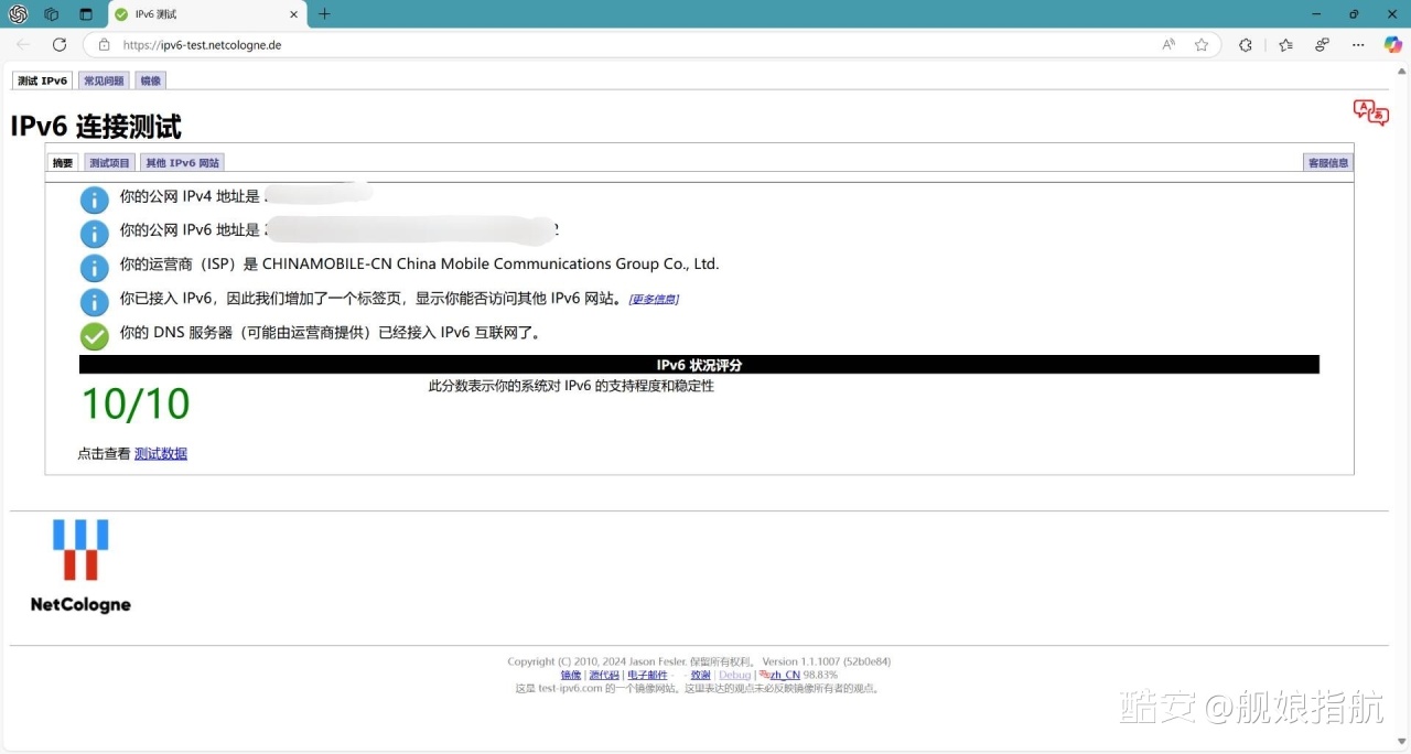 打开3.3.1IPv6连接测试链接: https://ipv6-test.netcologne.de/ 。