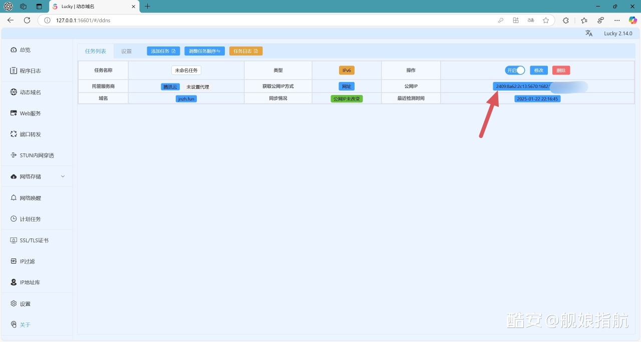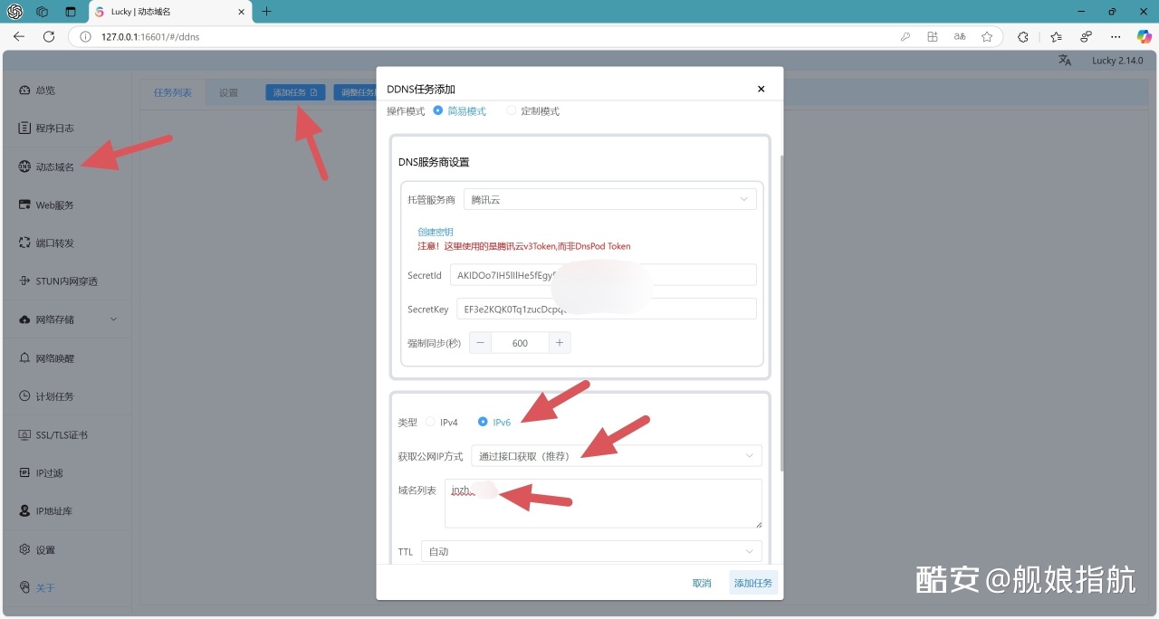 动态域名——添加任务——服务商选择腾讯云——填写你之前保存在记事本中的SecretId和SecretKey——类型选IPv6——通过接口获取——域名填写你购买的域名——添加任务。