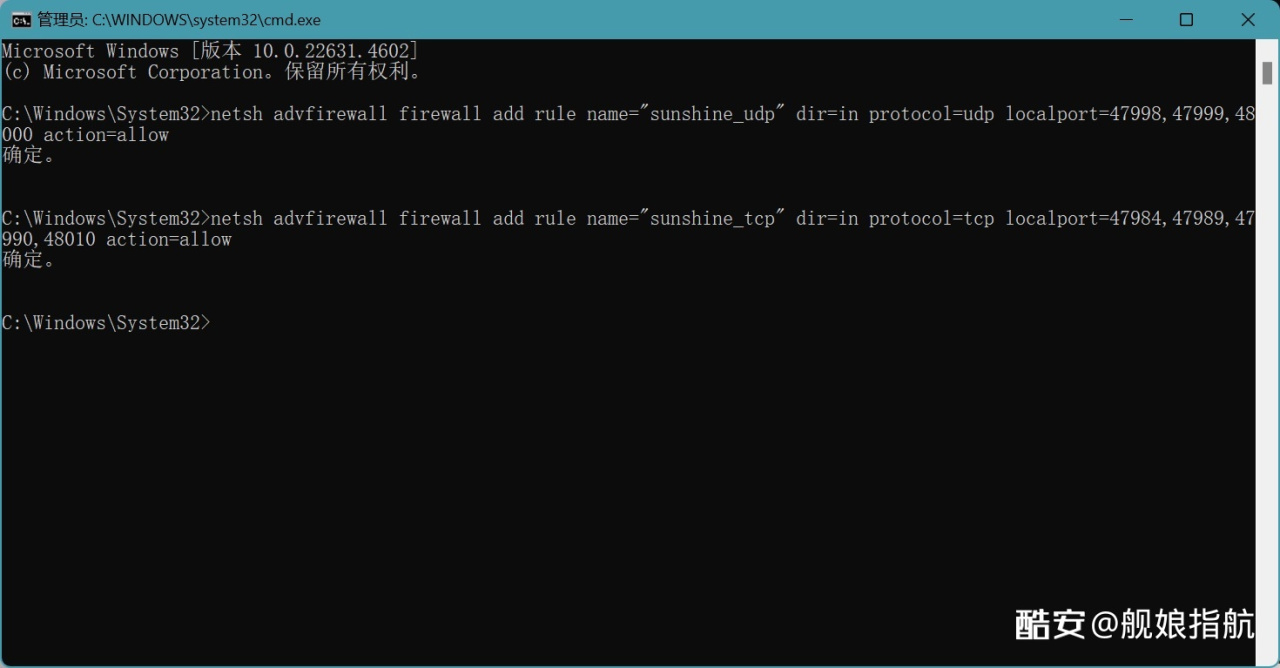 netsh advfirewall firewall add rule name="sunshine_udp" dir=in protocol=udp localport=47998,47999,48000 action=allow