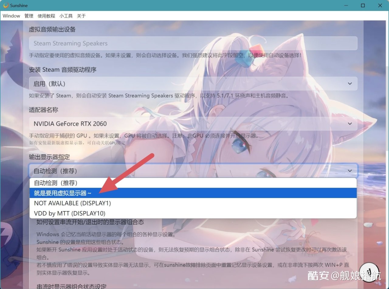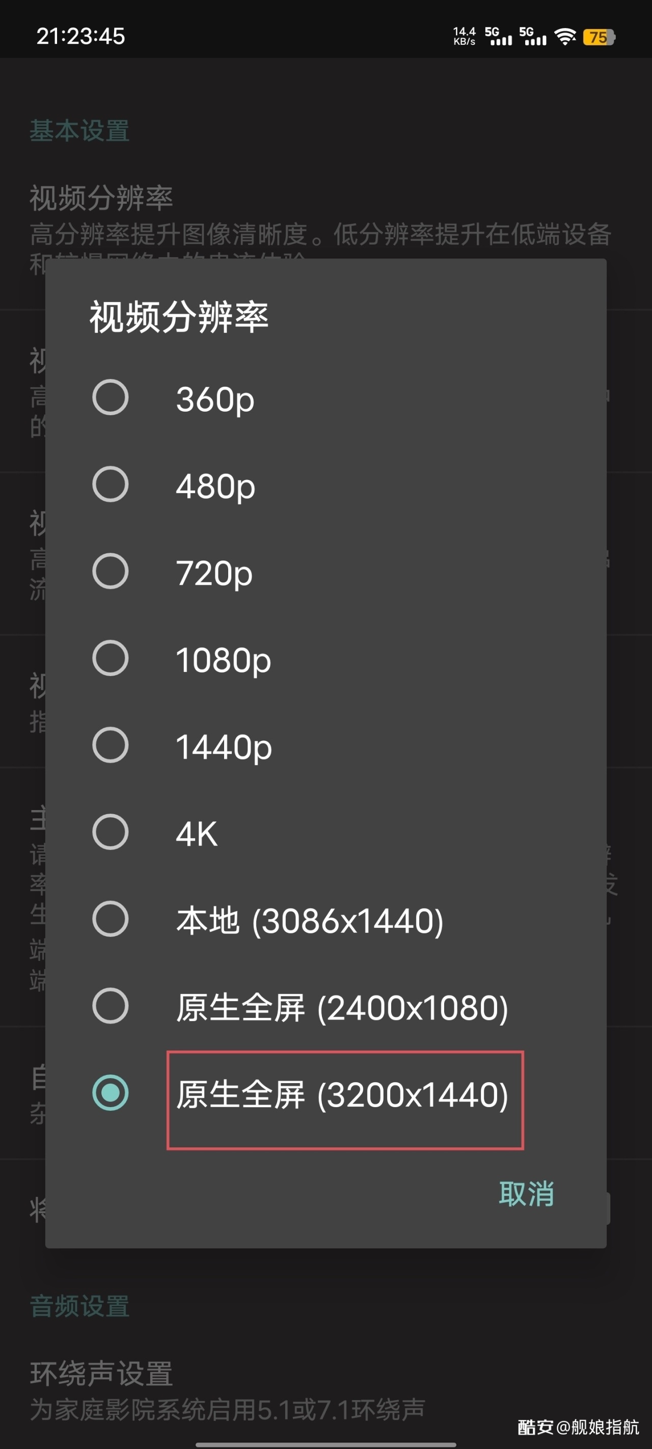 下图中的原生全屏分辨率是楼主安卓手机的分辨率,需要将它添加到上文的Sunshine虚拟显示器支持分辨率中。