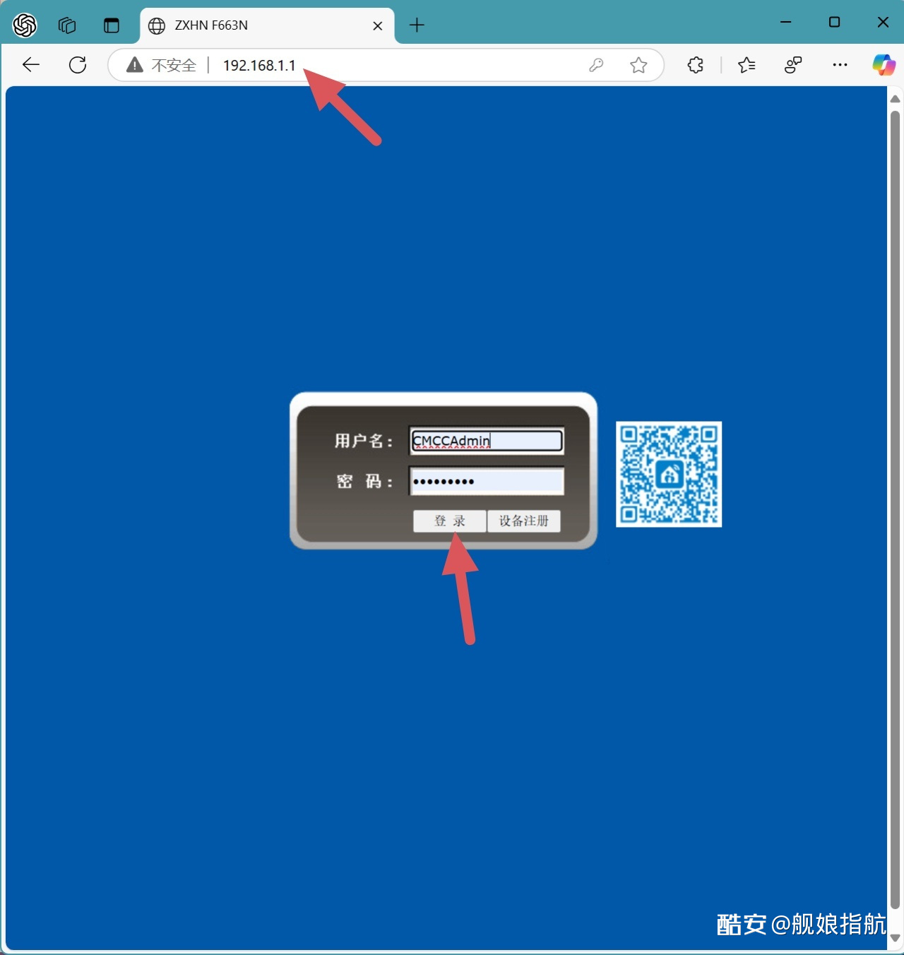 获取到超密后,你需要通过光猫WiFi或网线连接上光猫,在浏览器中输入默认配置地址192.168.1.1,输入超级账号密码进行登录。