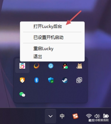 在任务栏中右键Lucky,设置开机启动,点击打开Lucky后台进行配置。