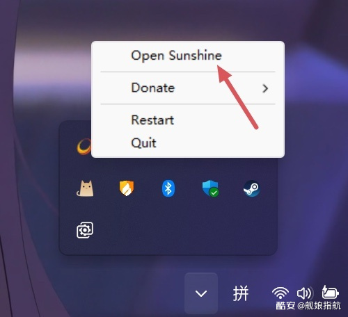 安装完成后在任务栏中右键Sunshine点击Open Sunshine进行配置。