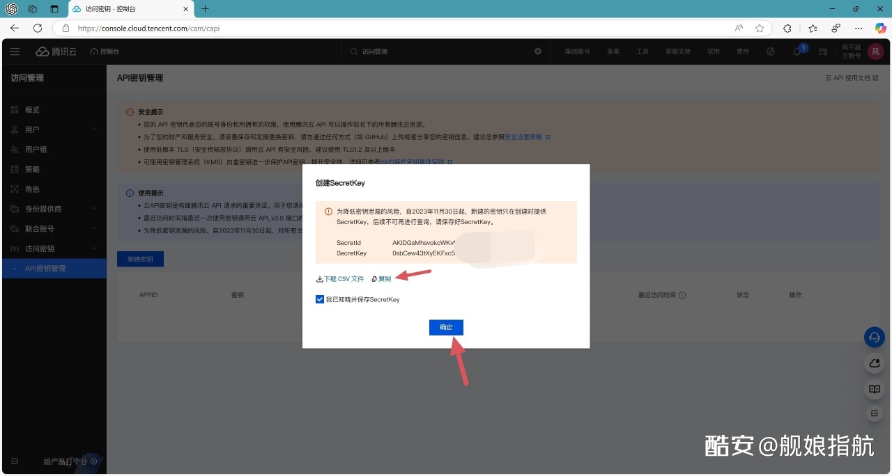 腾讯云搜索栏——搜索访问管理——访问密钥——API密钥管理——新建密钥,将SecretId和SecretKey复制到记事本中保存。