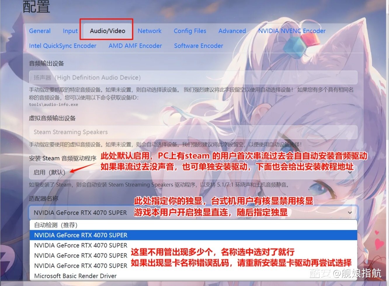 配置——Audio/Video——适配器名称选择你的独立显卡。